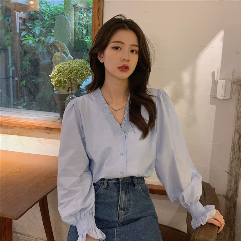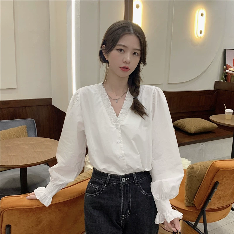 | nameOriginal | V-neck autumn new style French pleated wood ear shirt |