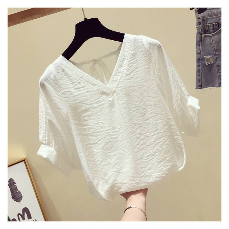 V-Neck Backless Imitation Chiffon Shirt Women’s Short-Sleeved 2024 New Korean Style Super Fairy Sweet Loose Slim Belly Covering Top
