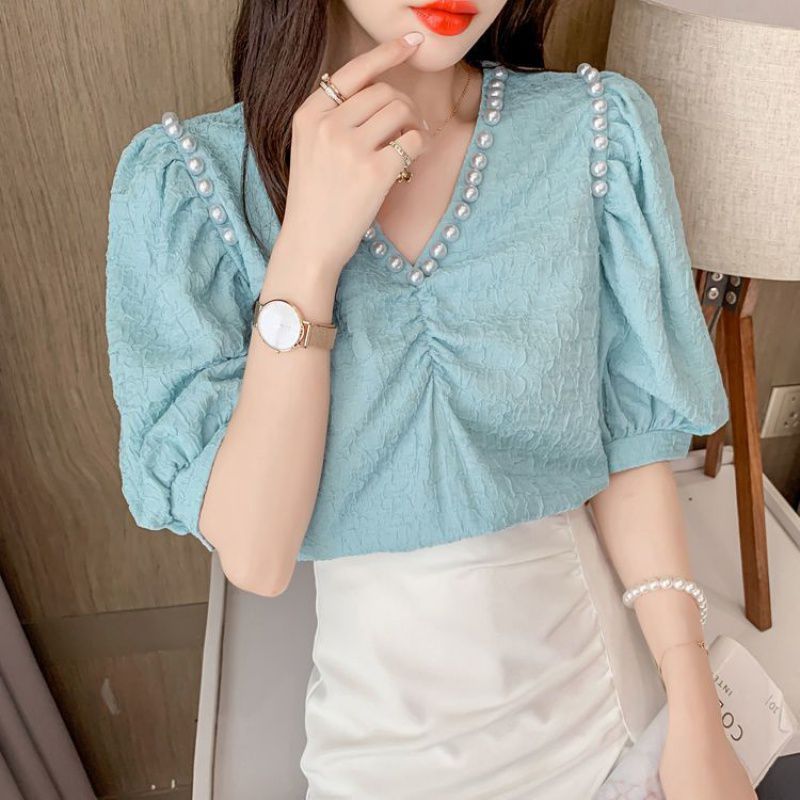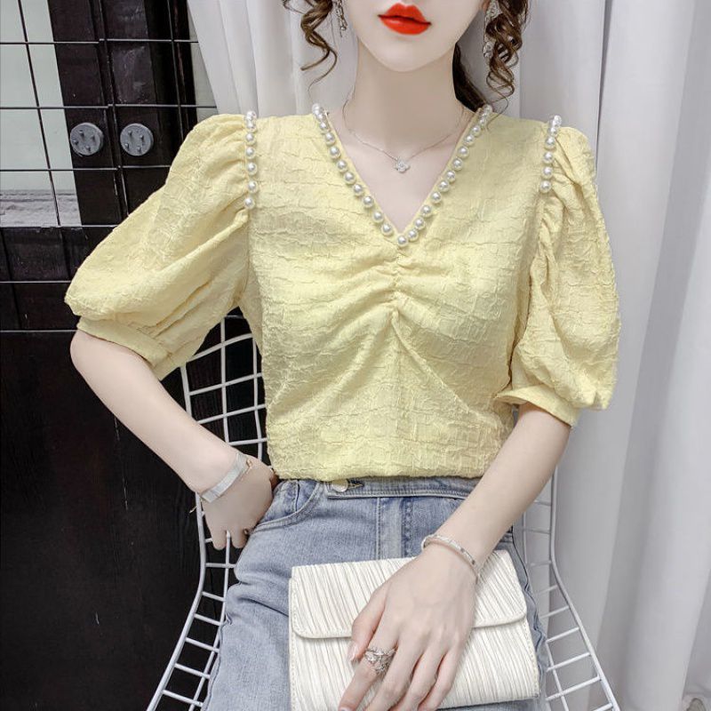 | nameOriginal | V-Neck Bead Embossed Chiffon Shirt Women's Summer New Arrival Fashionable All-Match Loose Slimming Bubble Short-Sleeved Top |