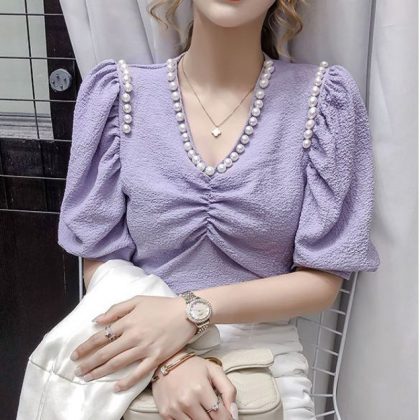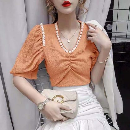 | nameOriginal | V-neck Bead Embossed Chiffon Shirt Women's Summer New Fashionable All-match Loose Slimming Bubble Short-sleeved Top |