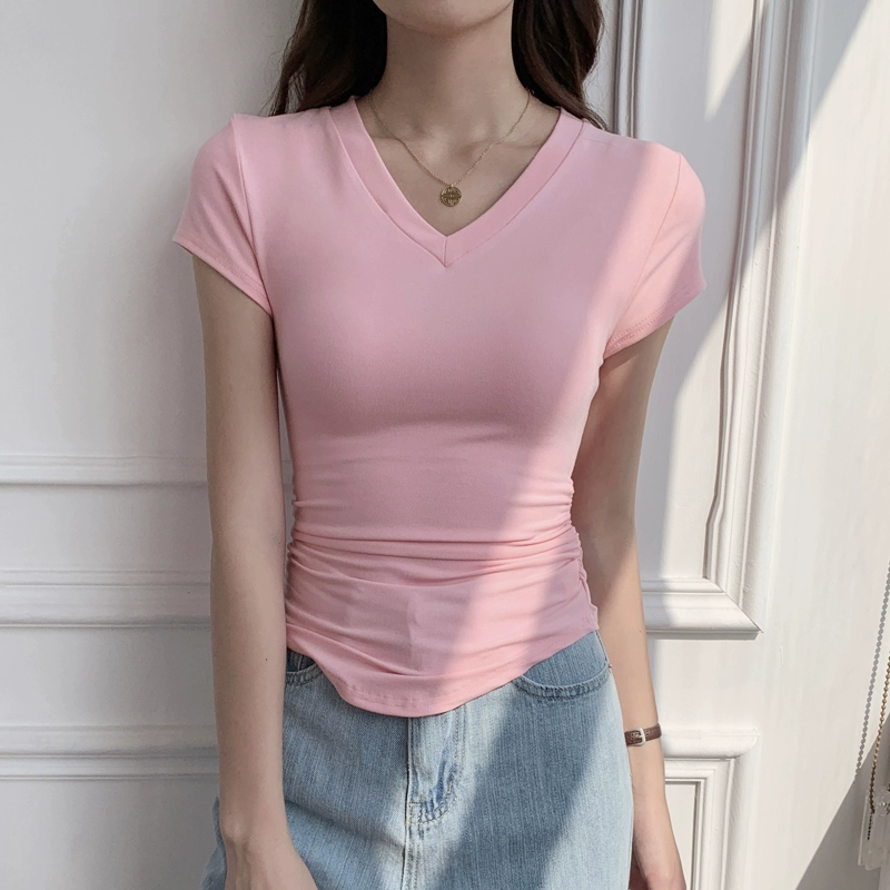 v-neck bust-showing pleated slim curved top short-sleeved t-shirt