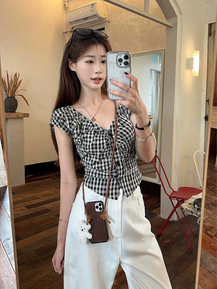 | nameOriginal | V-neck design slimming pleated plaid short sleeves |