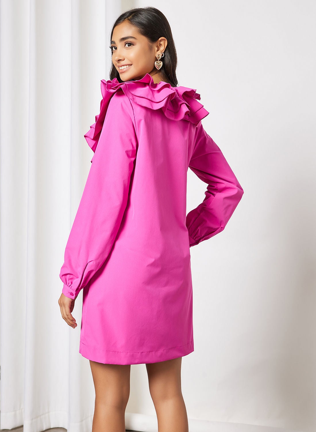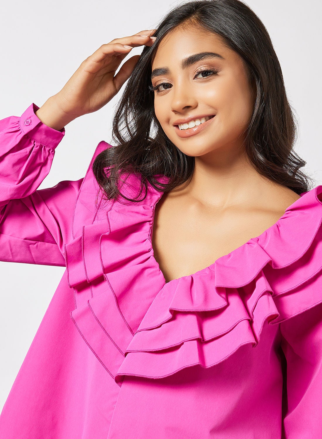 This product features a comfortable, loose-fitting design made from gentle polyester material. It includes a stylish V-neckline with a flounce accent and long sleeves with buttoned cuffs. To maintain its quality, please follow the care label instructions when washing. The model showcased in the product images is approximately 170cm tall and is wearing a size S.