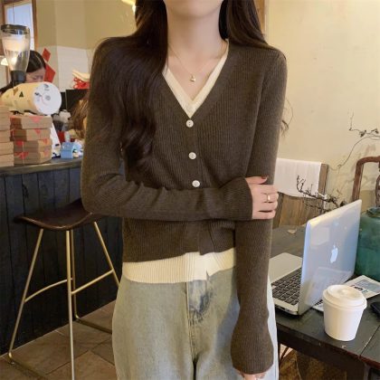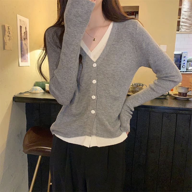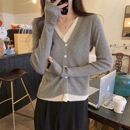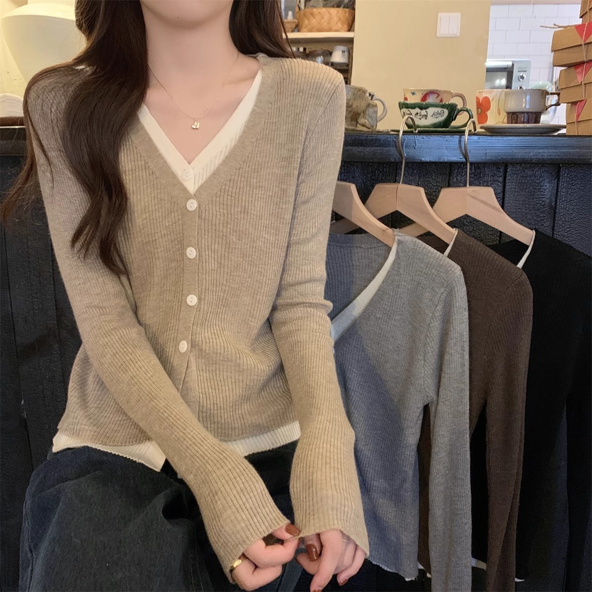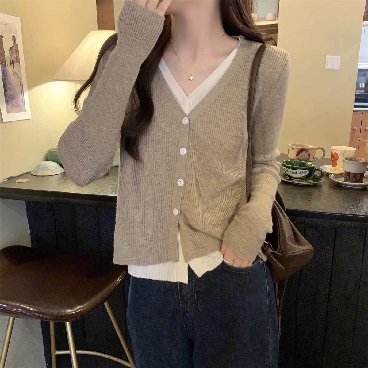 | nameOriginal | V-neck fake two-piece contrast sweater cardigan 2024 spring autumn winter South Korea slim lazy knitted base shirt women's top |