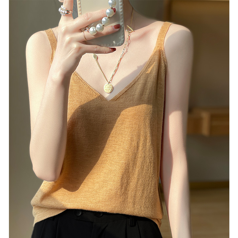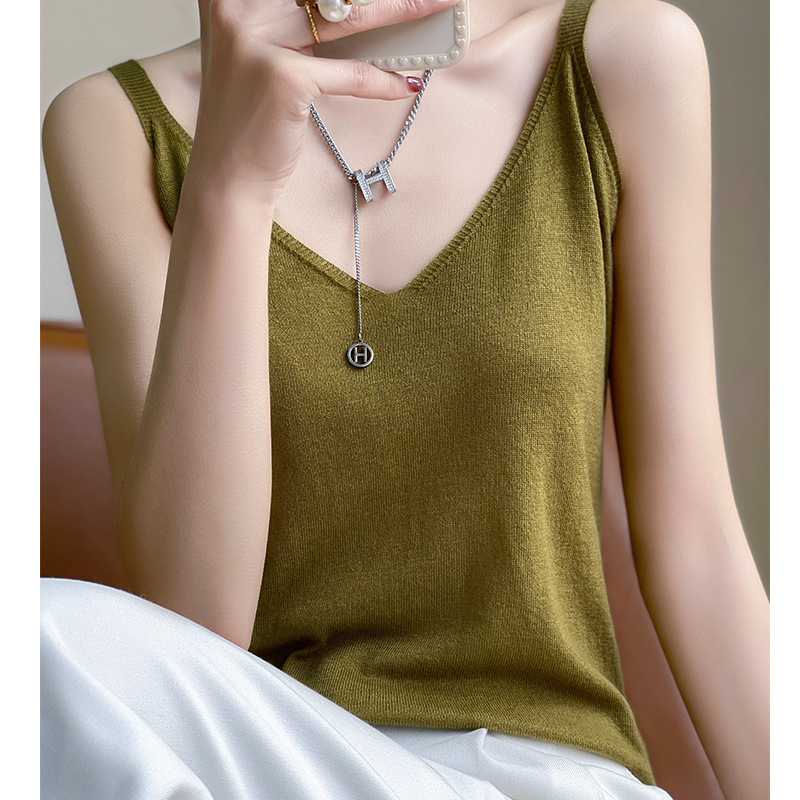 V-Neck Knitted Camisole Women's Summer Loose All-match Sleeveless Top 2024 New Sexy Inner Base T-shirt