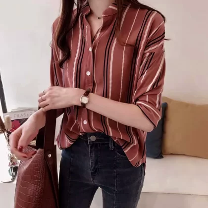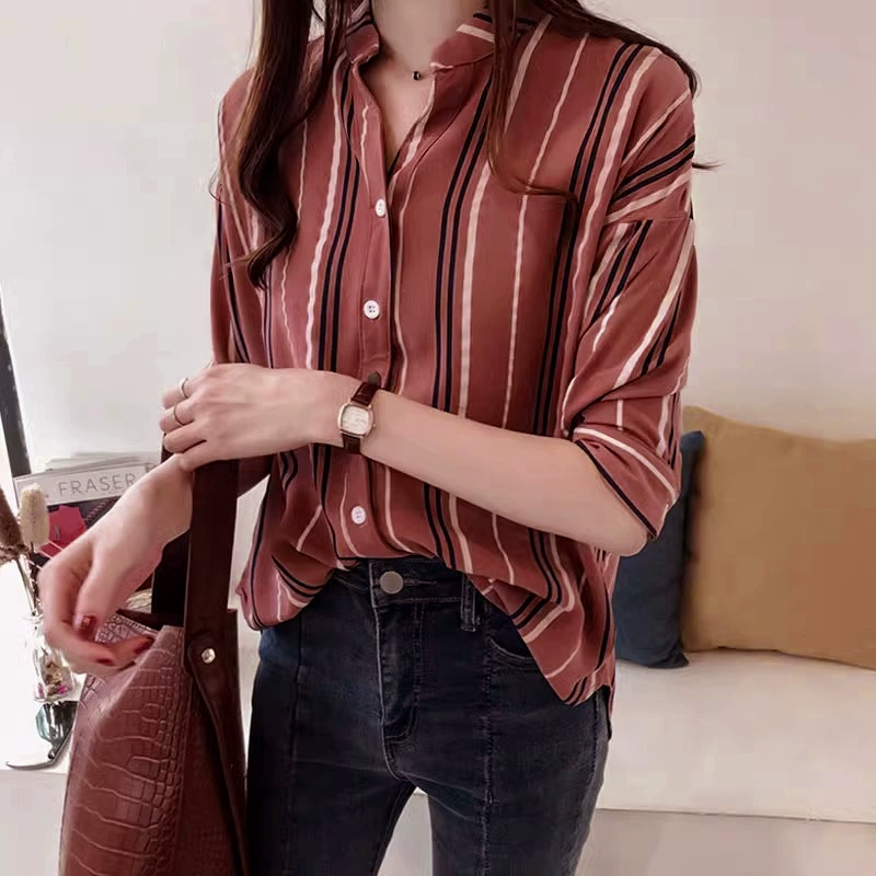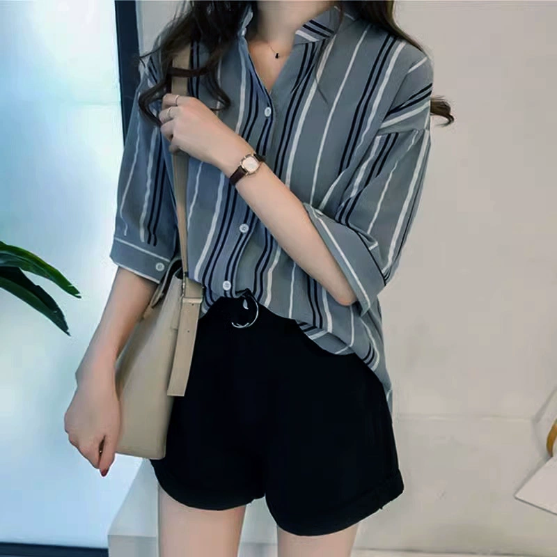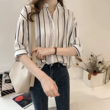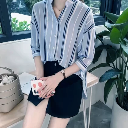 | nameOriginal | V-neck Korean style three-quarter sleeve loose and slim striped shirt |