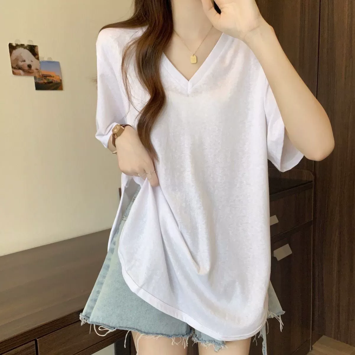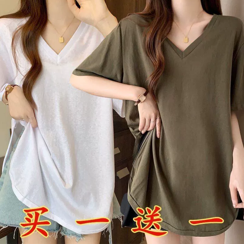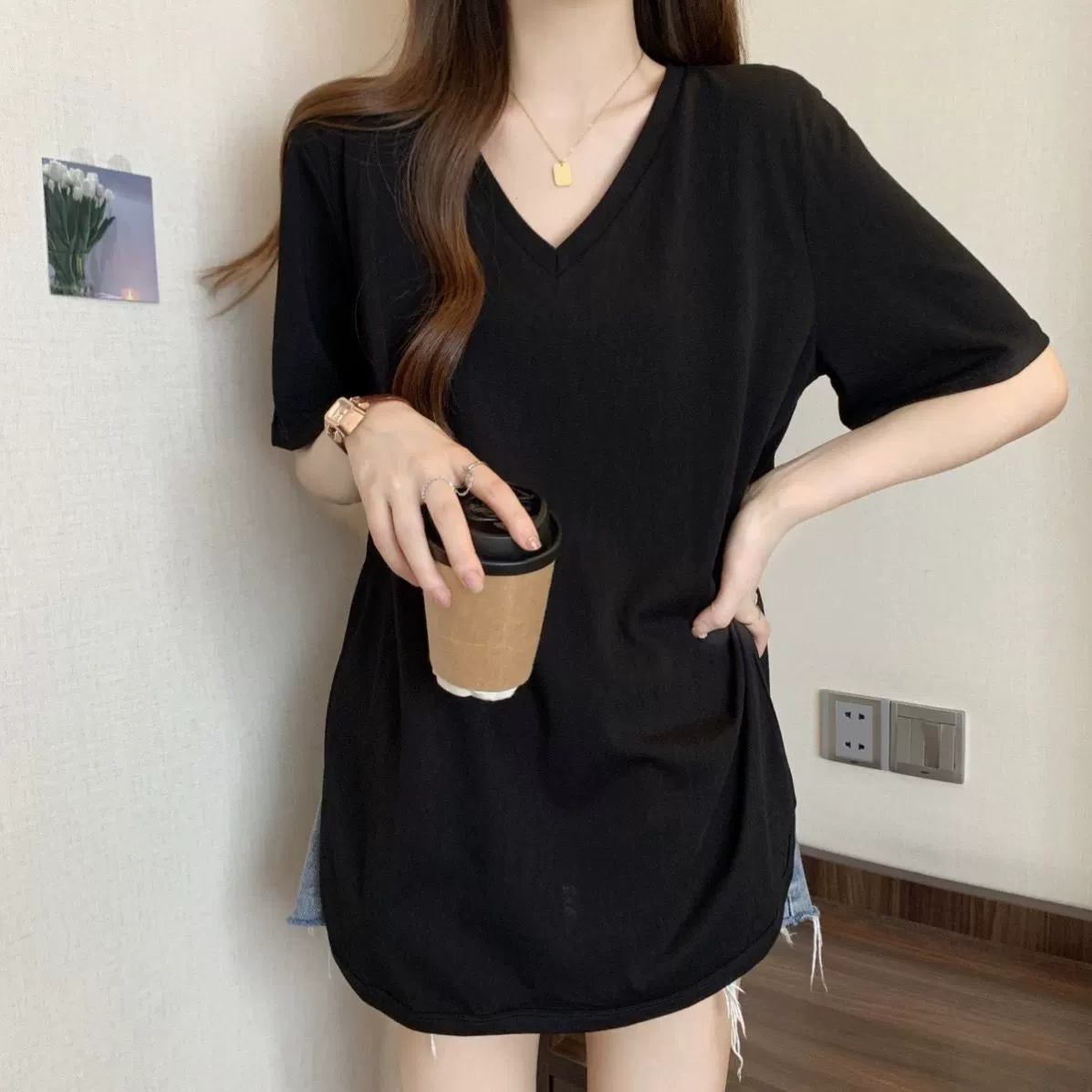 | nameOriginal | V-neck large size right shoulder fat mm slit loose flesh-covering T-shirt |