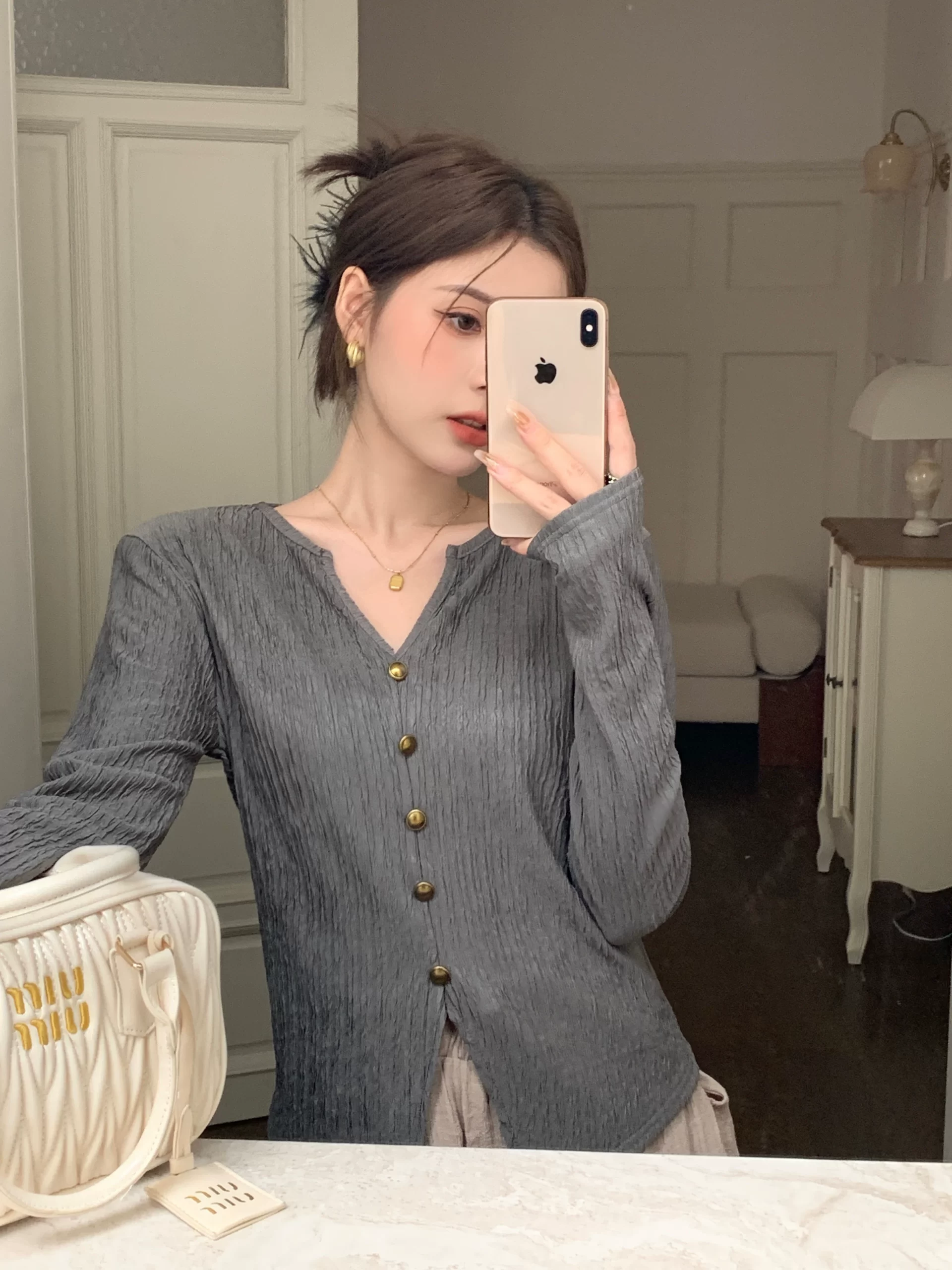 | nameOriginal | V-neck long-sleeved right shoulder niche fat mm slimming top T-shirt |