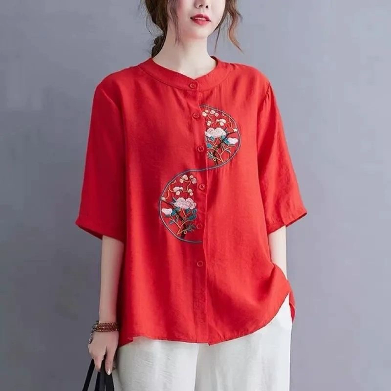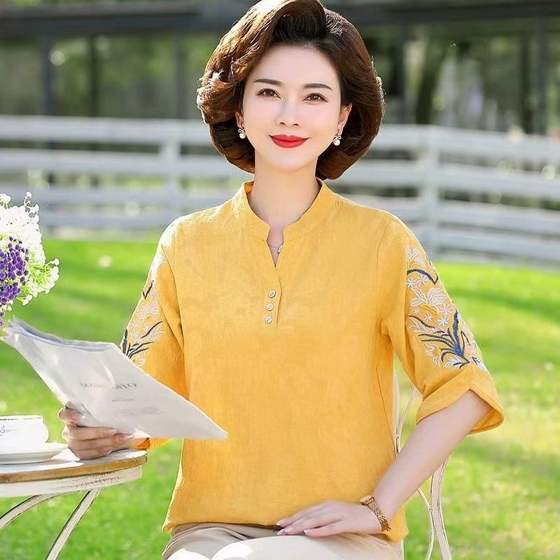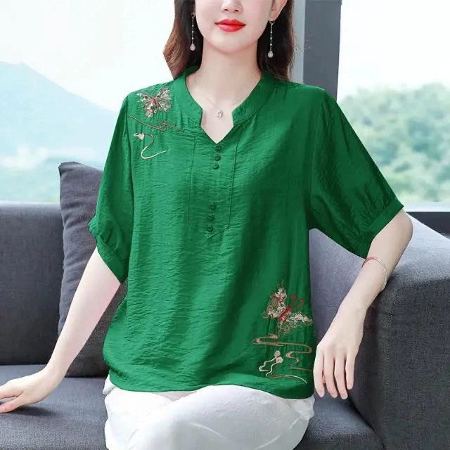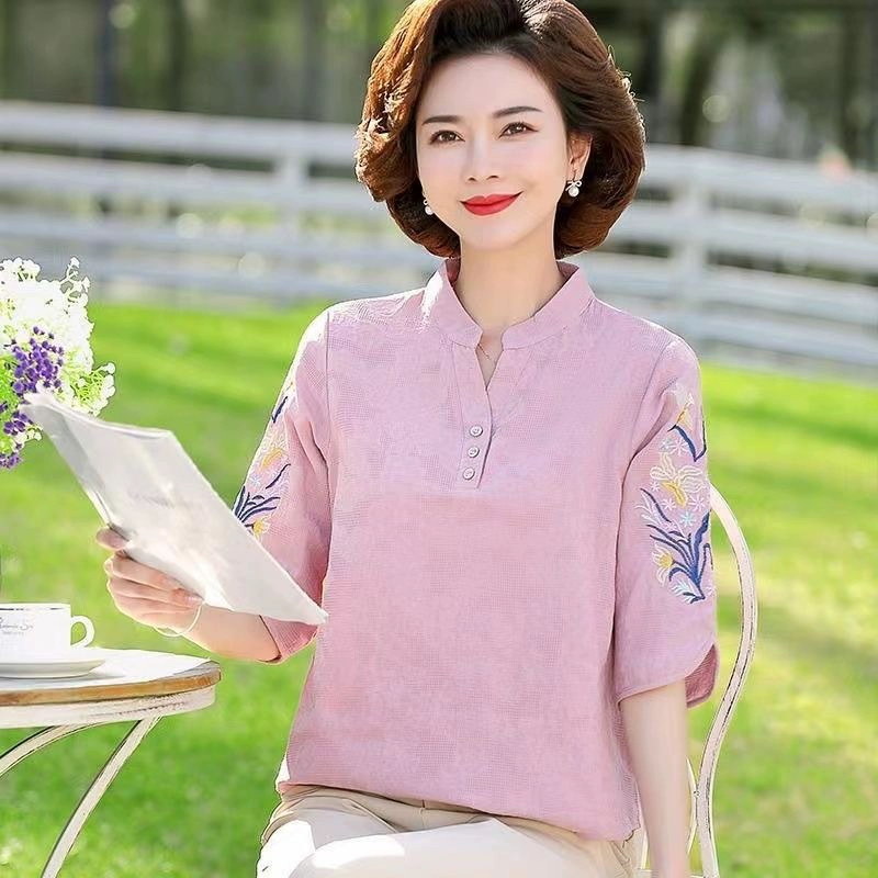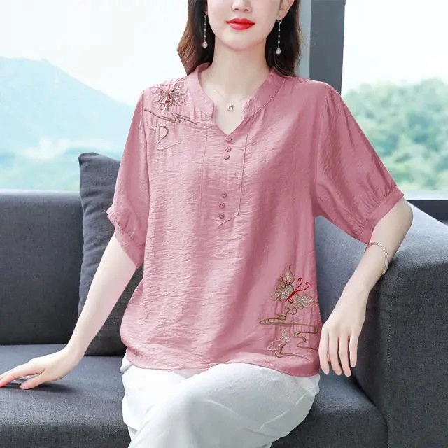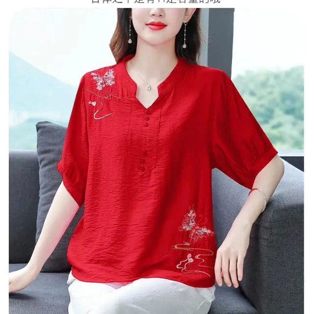| nameOriginal | V-neck middle-aged mother cotton and linen loose fat people embroidered T-shirt |
