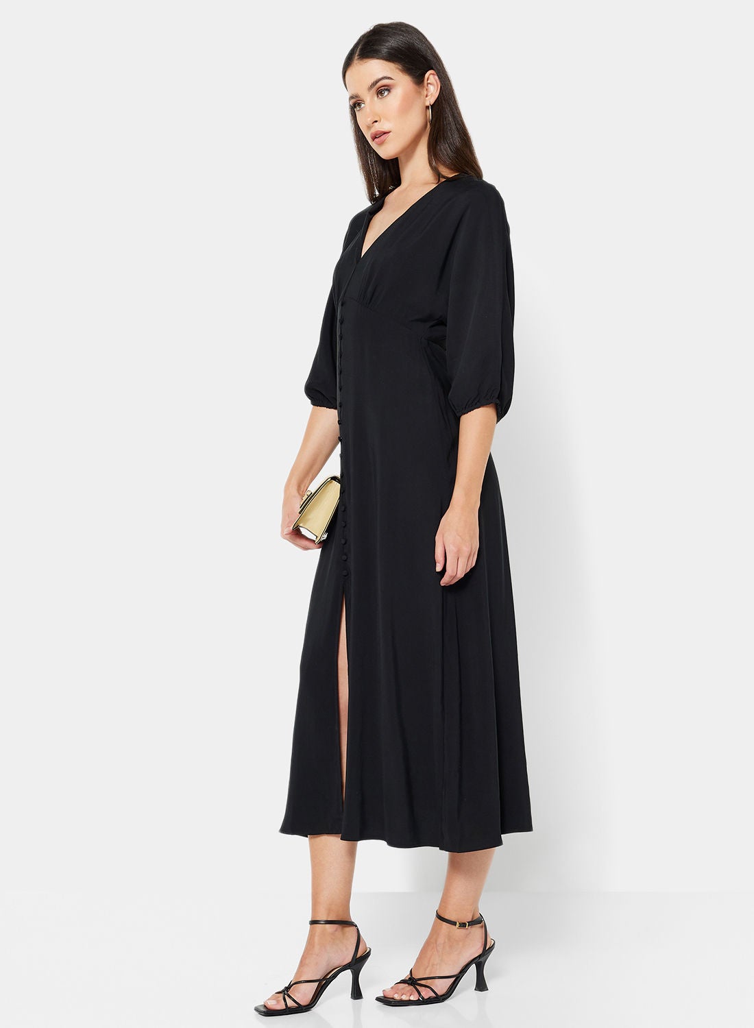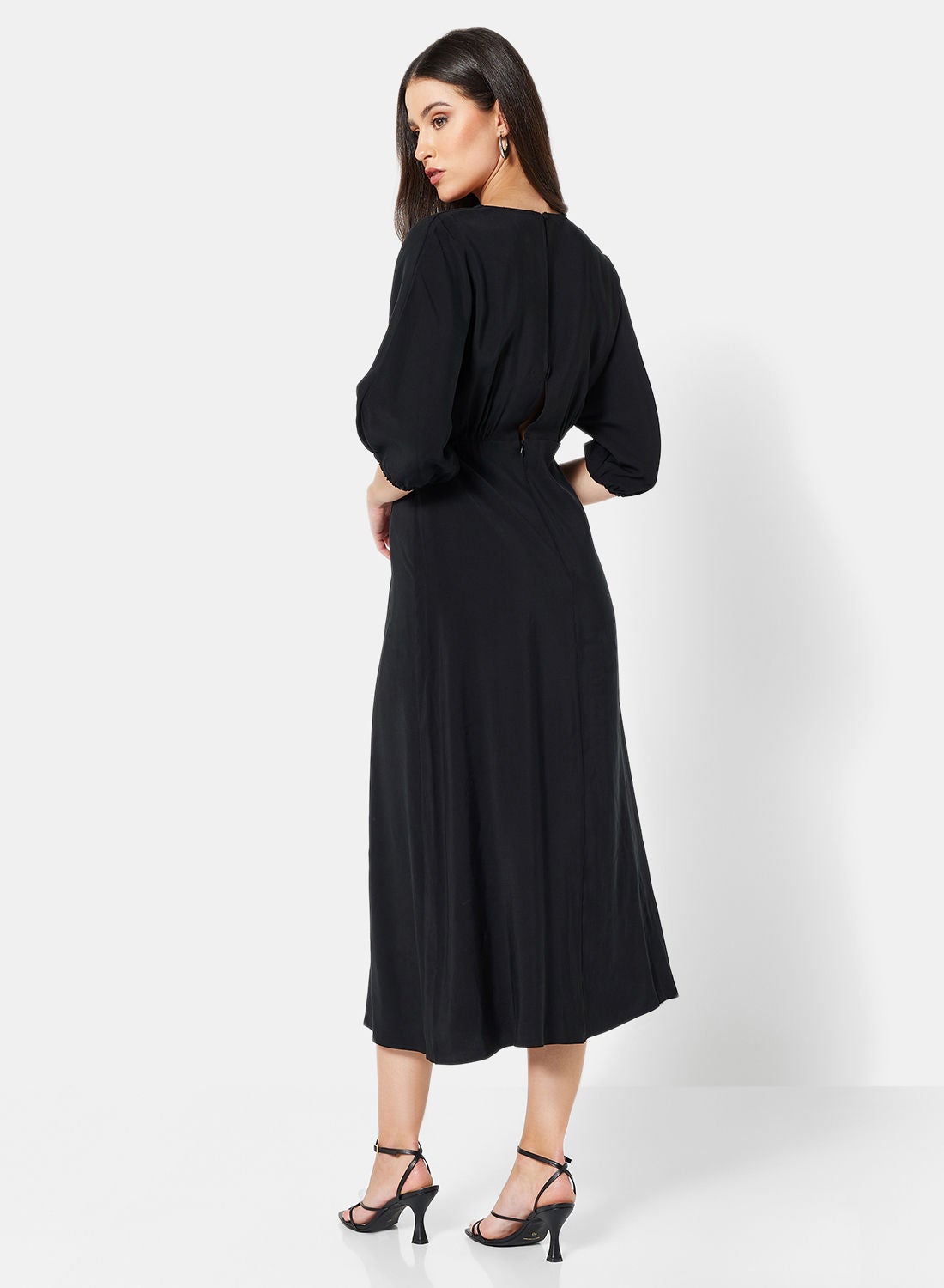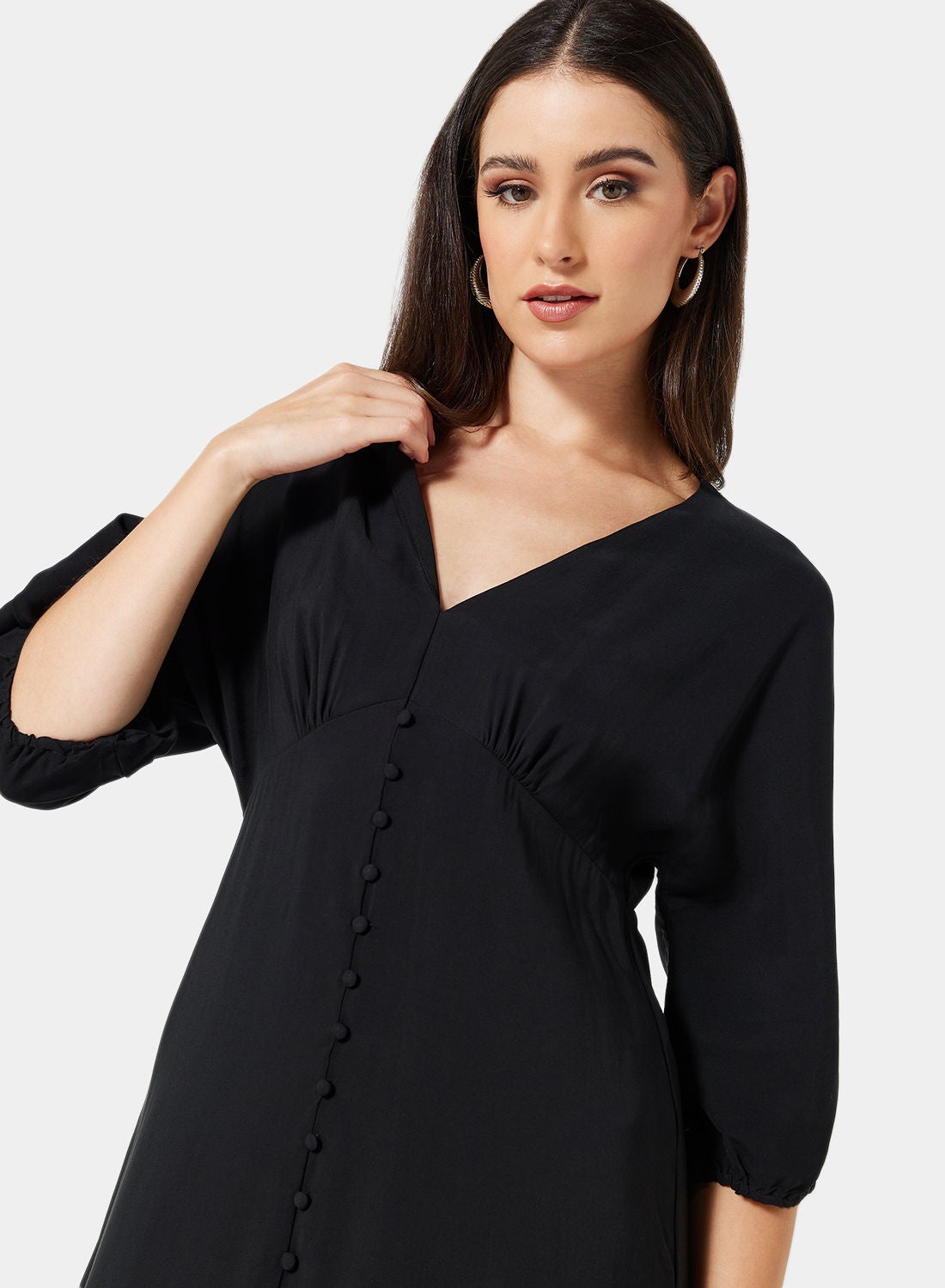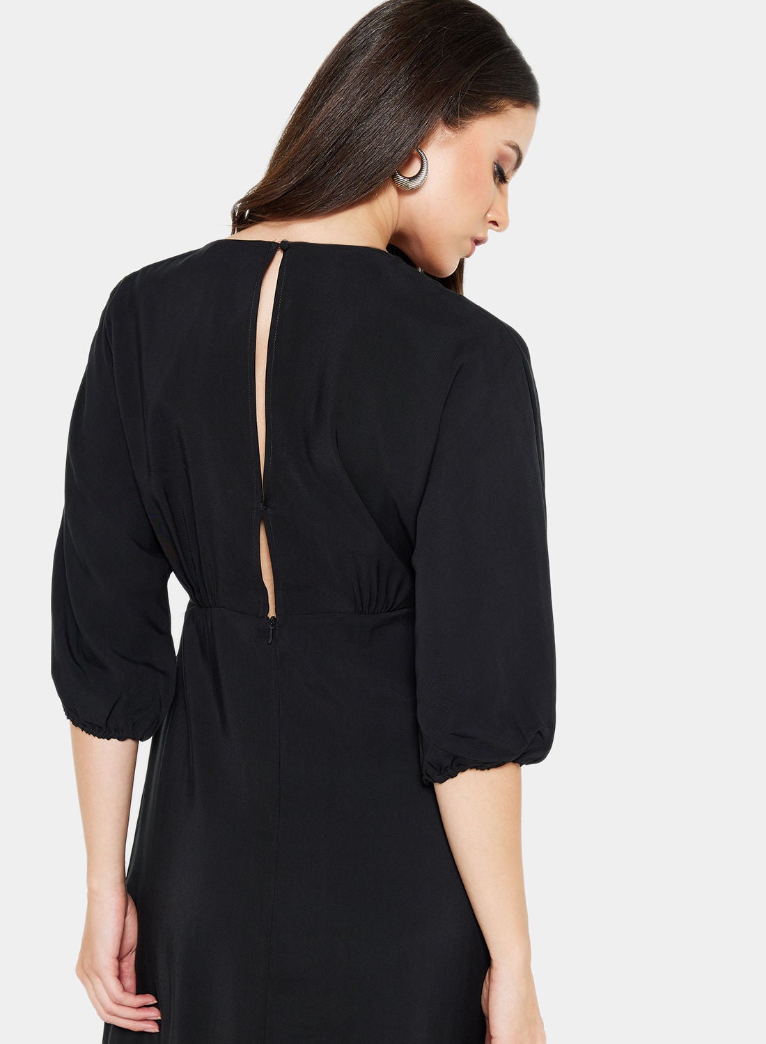 This product is a part of Mango’s Committed Collection and is made from a soft and comfortable blend of poly-viscose fabric. It features a V-neckline, three-quarter sleeves, and mock button details on the front. The back has a keyhole design with a button fastening, and the reverse has a concealed zipper placket. This product has a regular fit and is a midi length. Please refer to the care label instructions for washing. The model in the picture is approximately 180 cm tall and is wearing a size S.