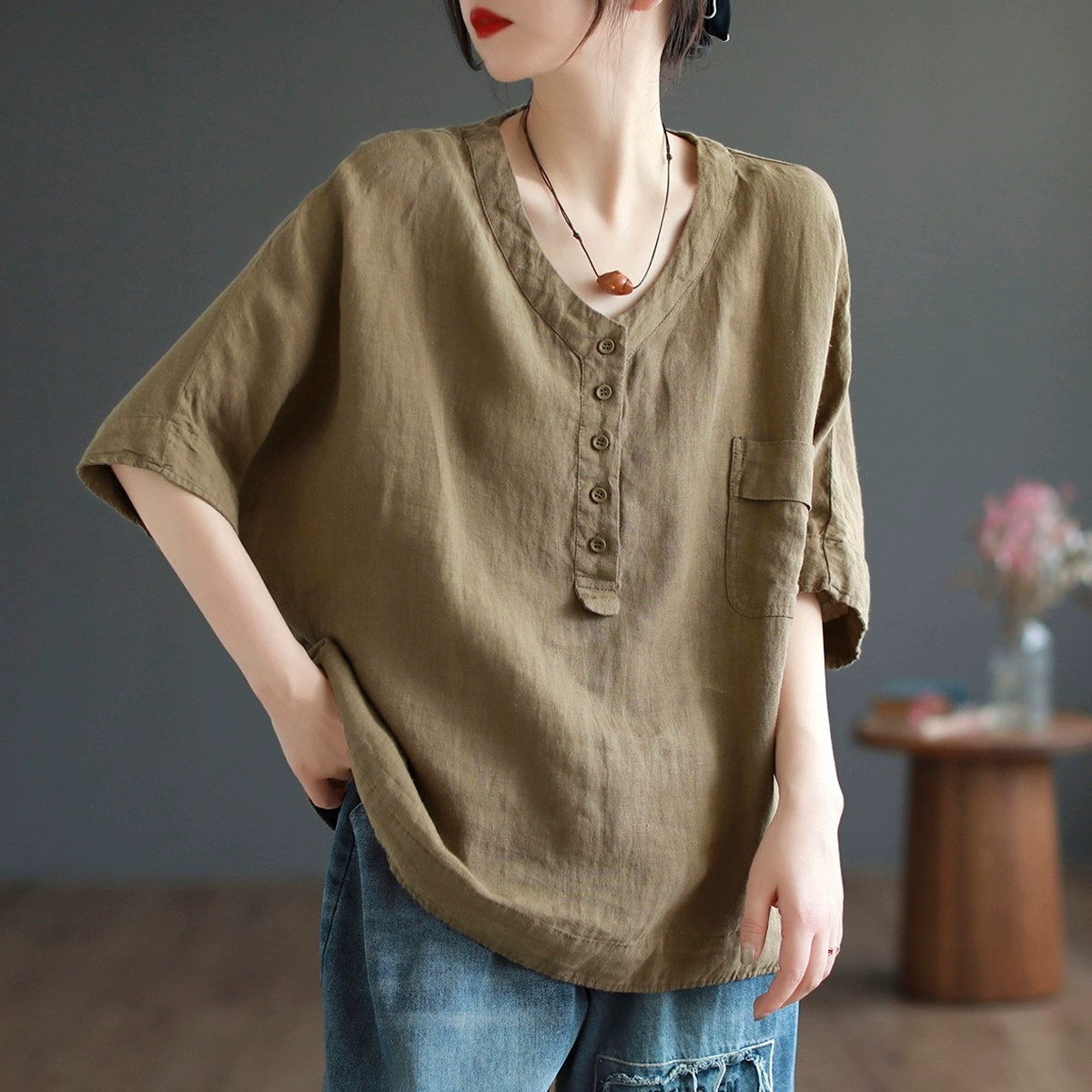 | nameOriginal | V-neck retro loose casual half-sleeve top linen |