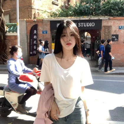 | nameOriginal | V-neck right shoulder summer loose solid color top short-sleeved t-shirt |