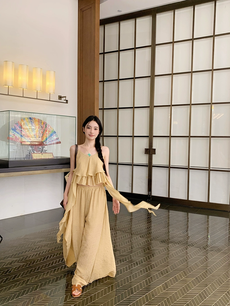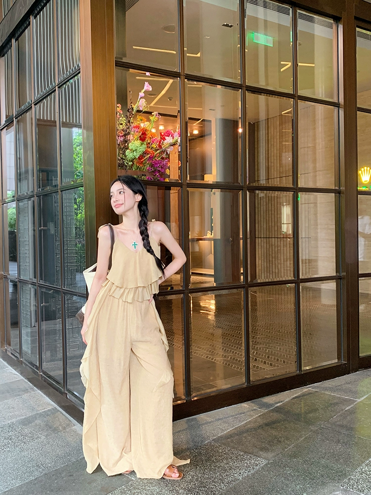 | nameOriginal | V-neck ruffled khaki trousers two-piece suspender set |