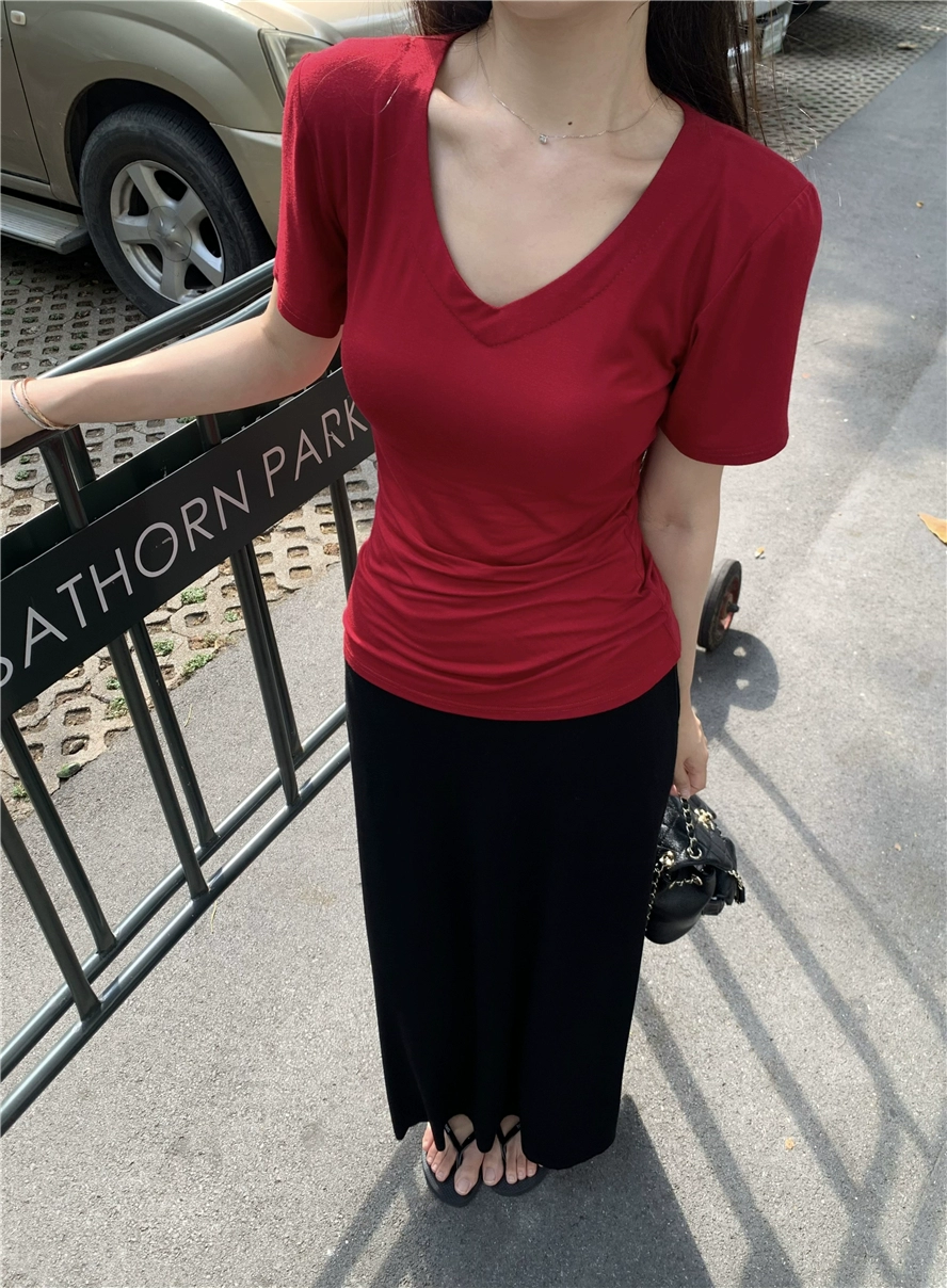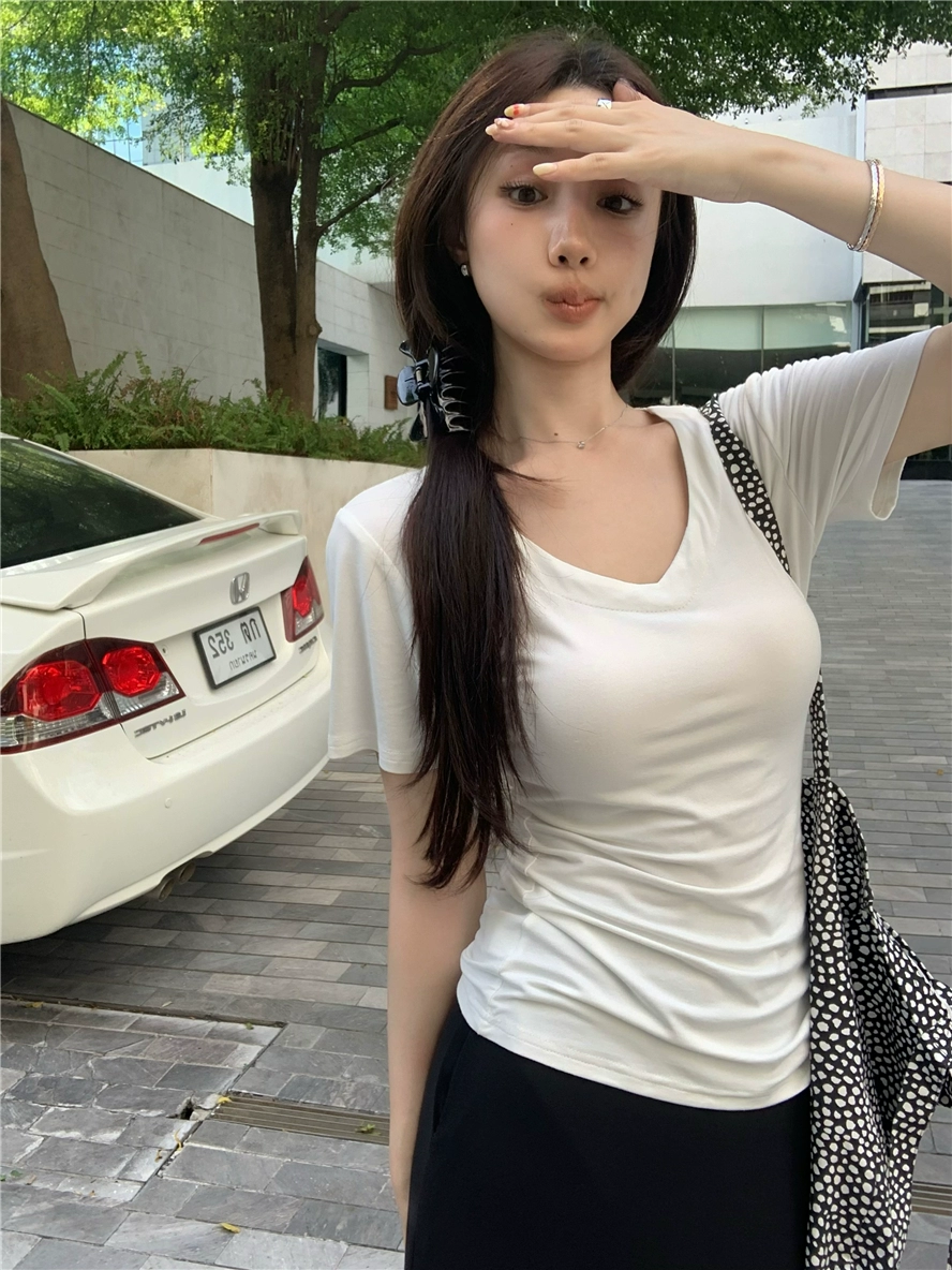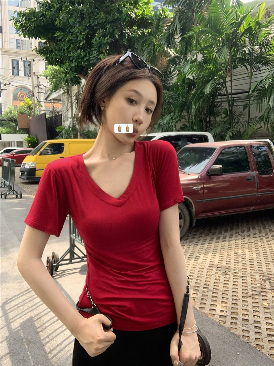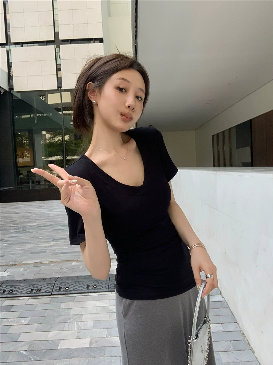 V-neck short-sleeved right shoulder summer 2024 new slim T-shirt