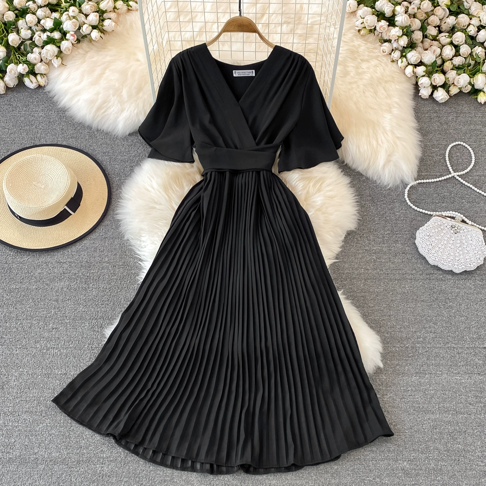 | nameOriginal | V-neck slim fit waist lace-up pleated dress with wide hem |