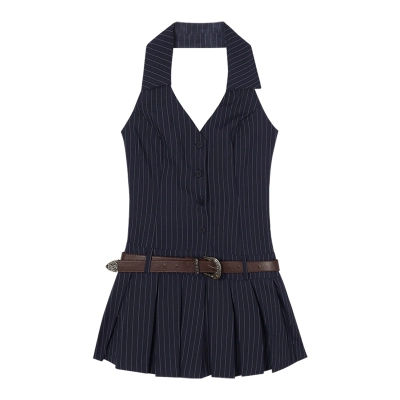 V-neck striped women’s summer belt pleated skirt backless halterneck