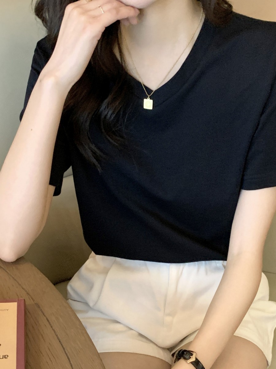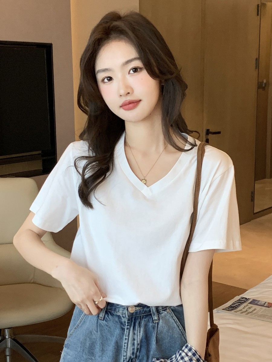 | nameOriginal | V-neck T-shirt women's short sleeve white loose slim 2024 summer new cotton shoulder chicken heart collar solid color top |