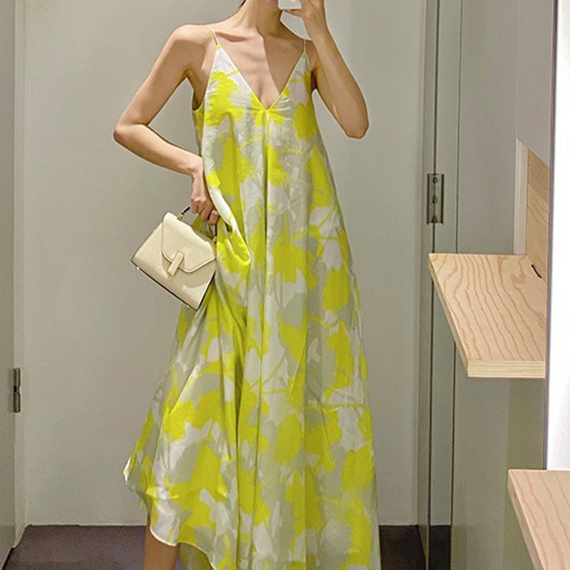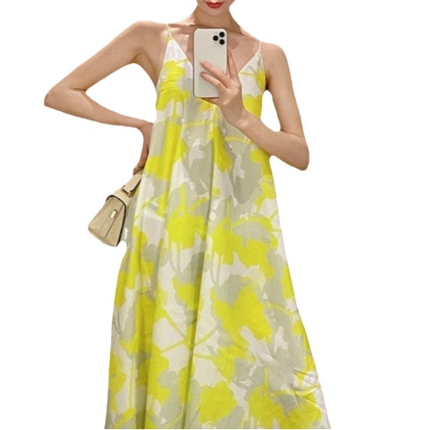 Vacation-style Printed Mid-length Strap Backless V-neck Dress Sanya Super Fairy Over-the-Knee Dress Fairy Dress