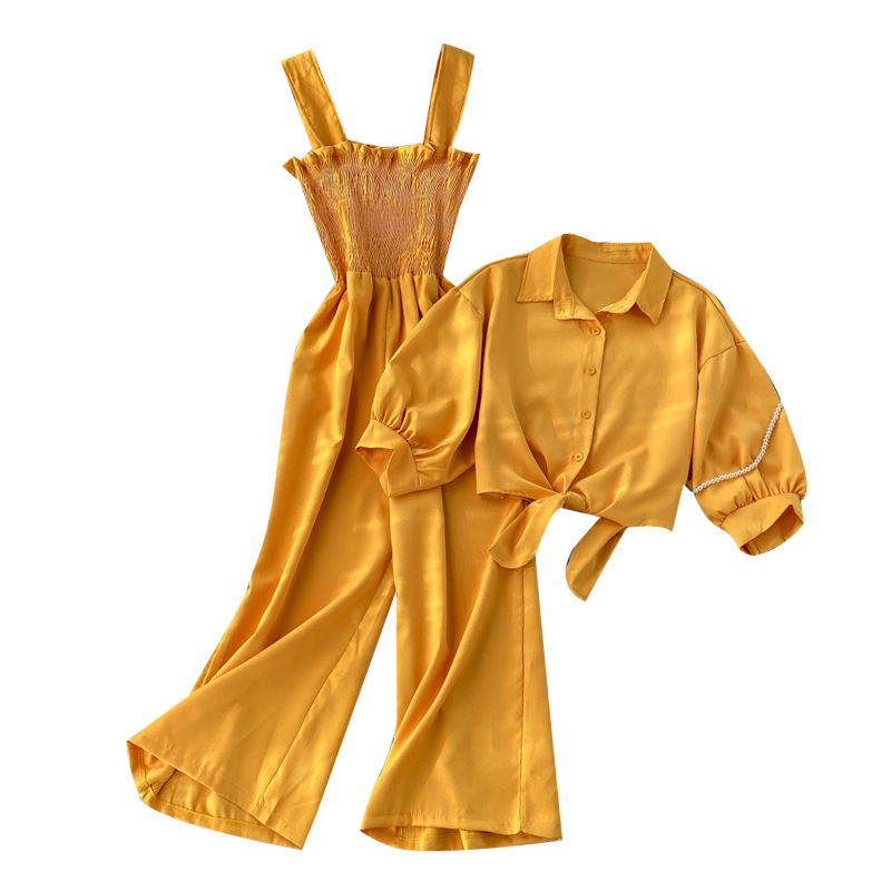 | nameOriginal | Vacation Style Two-Piece 2020 New Arrival Strap Pleated Wide-Leg Pants Collar Short-Sleeved Cardigan Shirt Women's Trendy |