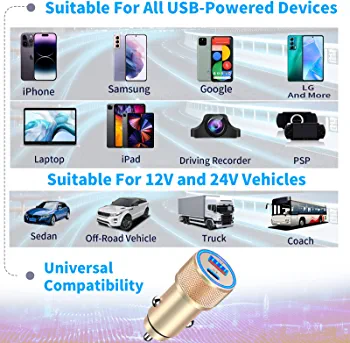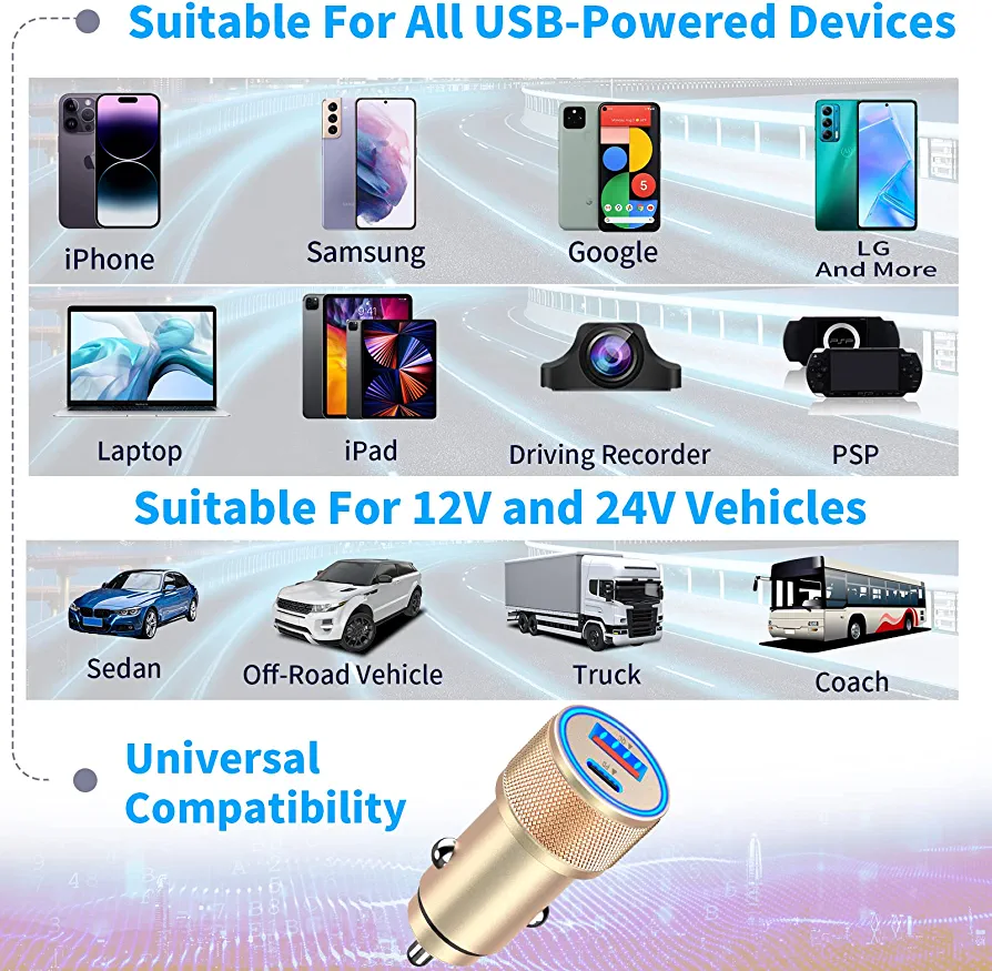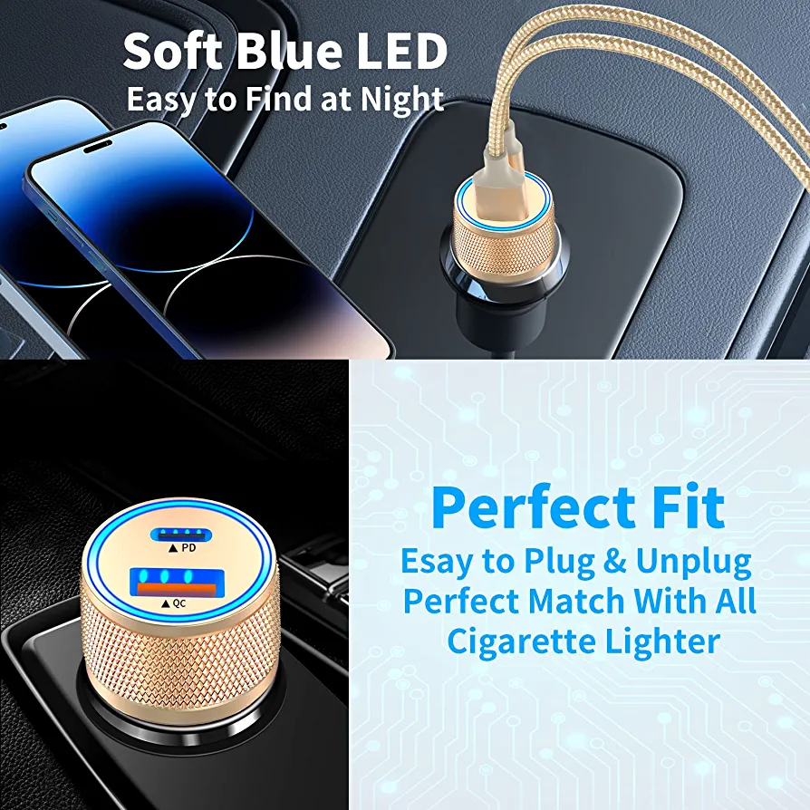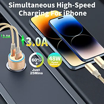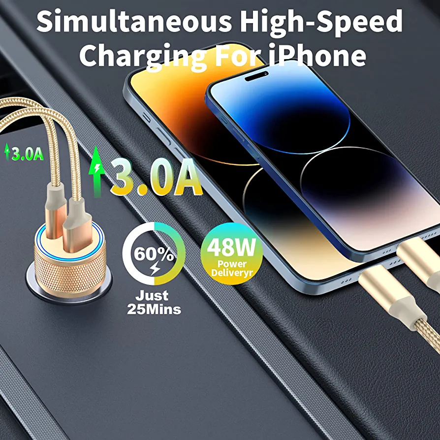 2. Dual port PD/QC3.0 usb c fast car charger provide charge speed up to 48W, You can charge two devices simultaneously while travel.