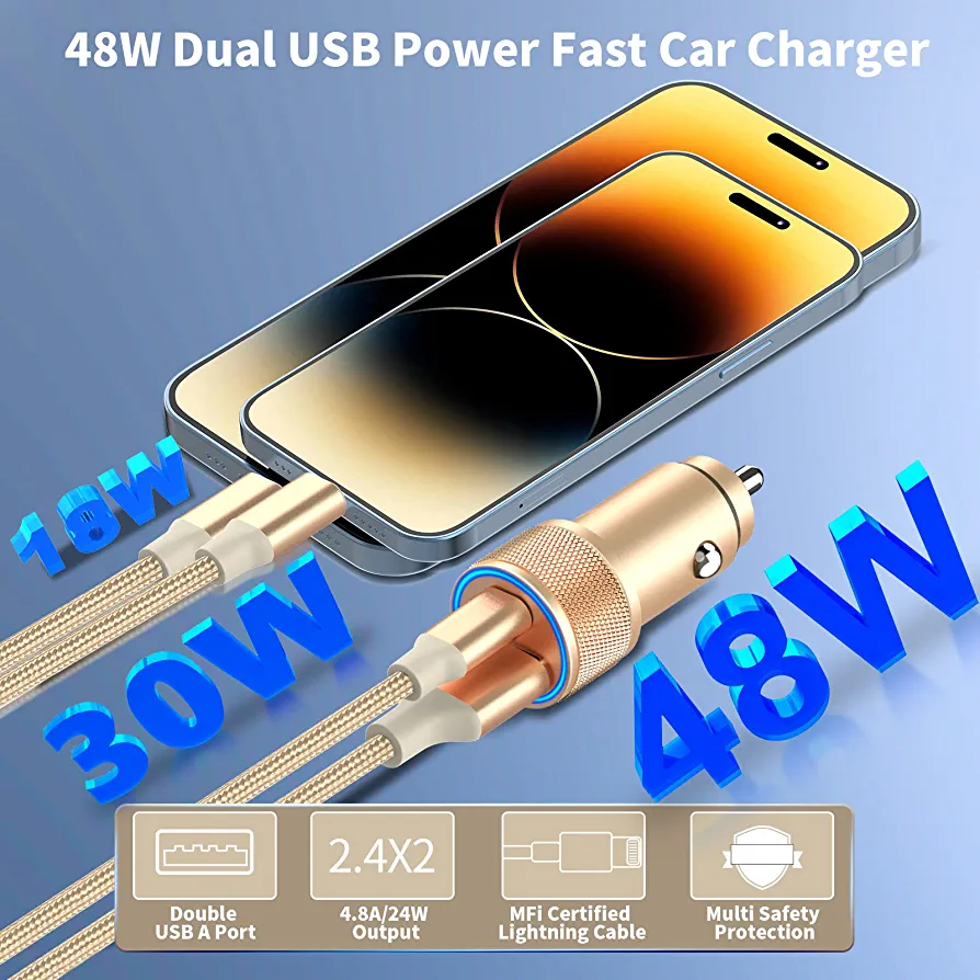 2. 1 * 48W Dual Port USB-C PD&QC 3.0 Fast Car Charger + 2 * MFi Certified Lightning Braided Cable.