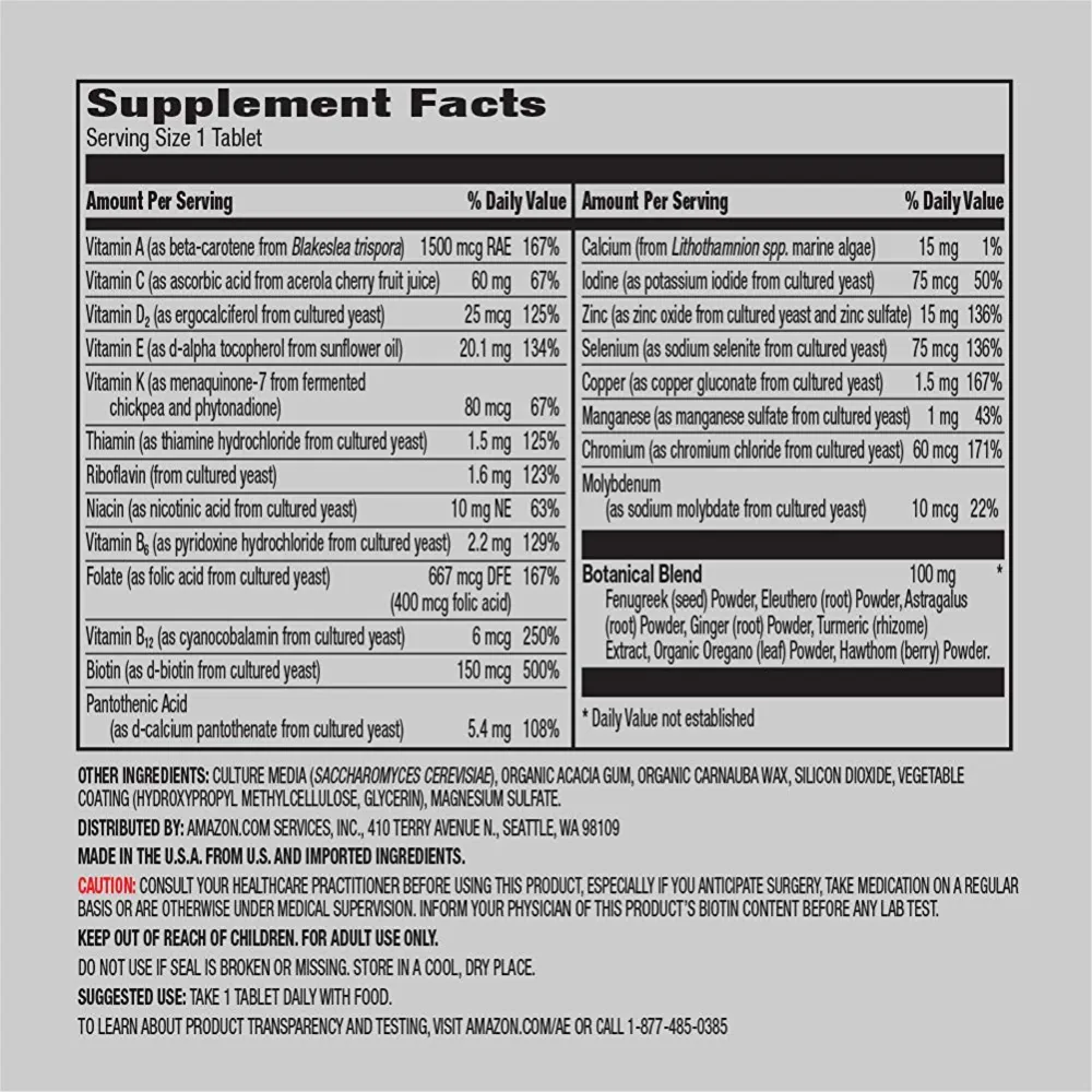 Our Men’s One Daily Multivitamin is packed with 21 essential vitamins and minerals, along with a botanical blend. Over 60% of the ingredients are sourced from whole foods, making it a highly nutritious supplement. If you’re a fan of New Chapter Every Man’s One Daily Multi, we recommend giving Amazon Elements Men’s One Daily Multivitamin a try.
