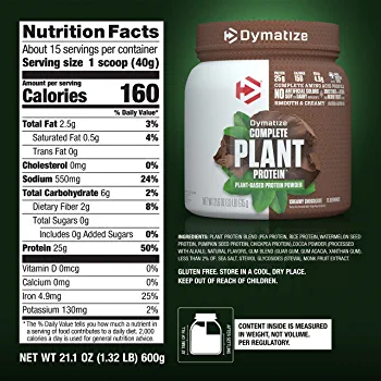 Applying over 25 years of science-driven athletic nutrition expertise, Dymatize offers a non dairy, plant-based, vegan protein powder formulated for men and women of all skill levels. This expertly crafted protein blend of pea, brown rice, watermelon seed, pumpkin seed and chickpea provides 25g of complete protein, 0g sugar, 160 calories per serving, delivers 9.9g Essential Amino Acids, including 4.9g BCAAs. This dairy free protein powder is also a lactose free protein powder in addition to being soy free and gluten free. Dymatize Complete Plant Protein™ is a deliciously smooth and creamy plant-based, performance-driven protein powder that is engineered to support your muscles and help your body recover with high-quality plant-based protein and a complete amino acid profile.