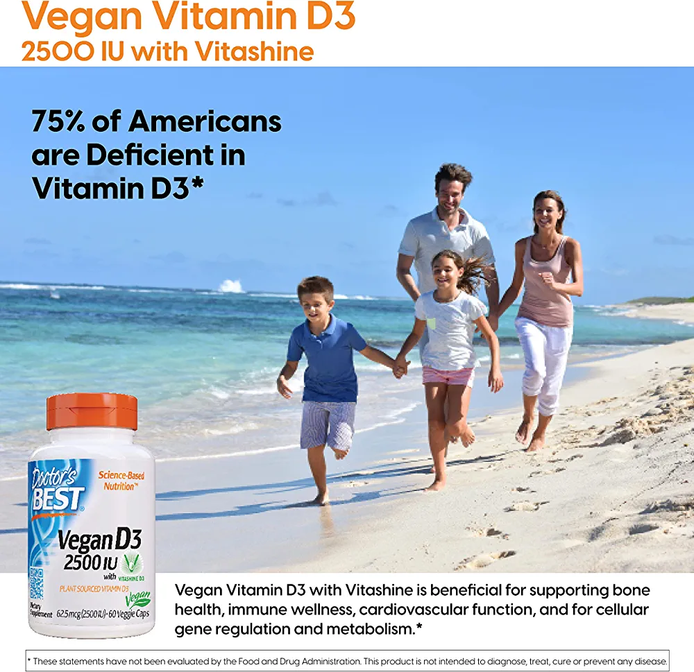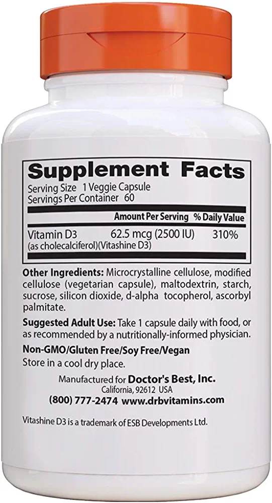 | nameOriginal | Doctor's Best Vitamin D3 2500IU with Vitashine D3, Non-GMO, Vegan, Gluten & Soy Free, Regulates Immune Function, Supports Healthy Bones, 60 Count |