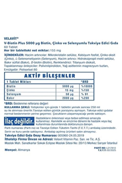 | nameOriginal | Velavit V-biotin Plus 5000mcg Supplement Food 60 Tablets |