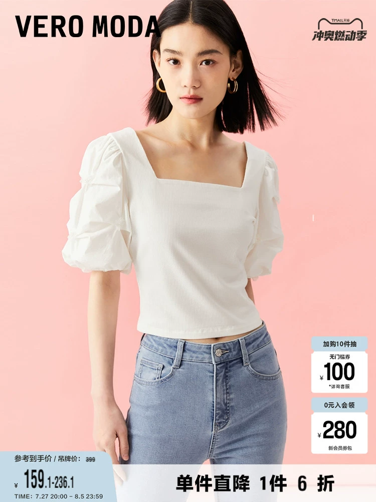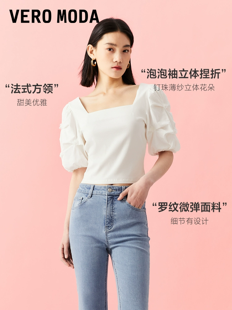 | nameOriginal | Vero Moda Ole T-shirt women's summer new square collar puff sleeves pinch pleats sweet temperament slim top versatile |