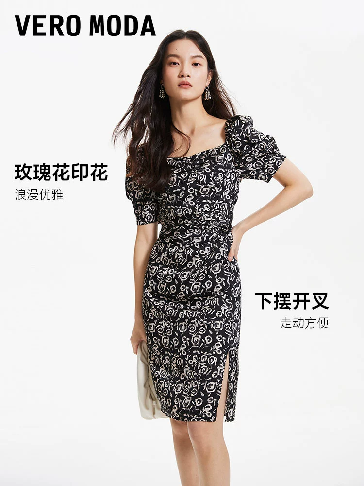| nameOriginal | Vero Moda Outlet Dress 2024 Spring and Summer New Elegant Rose Print Pinch Puff Sleeves Slit |