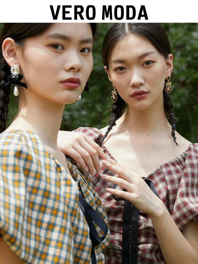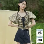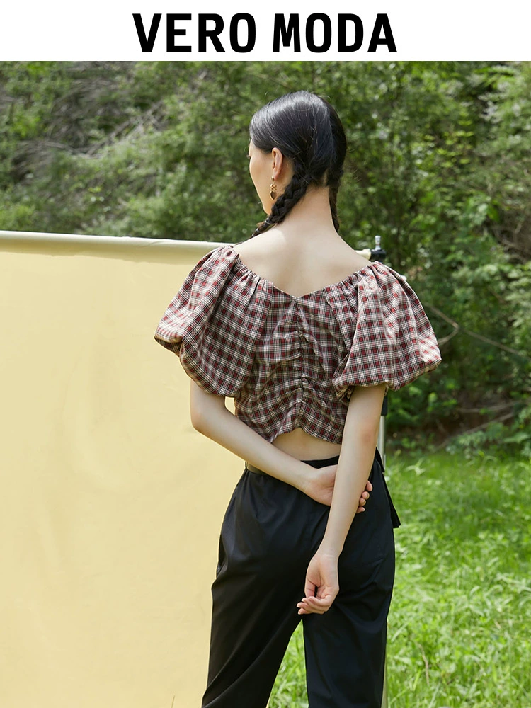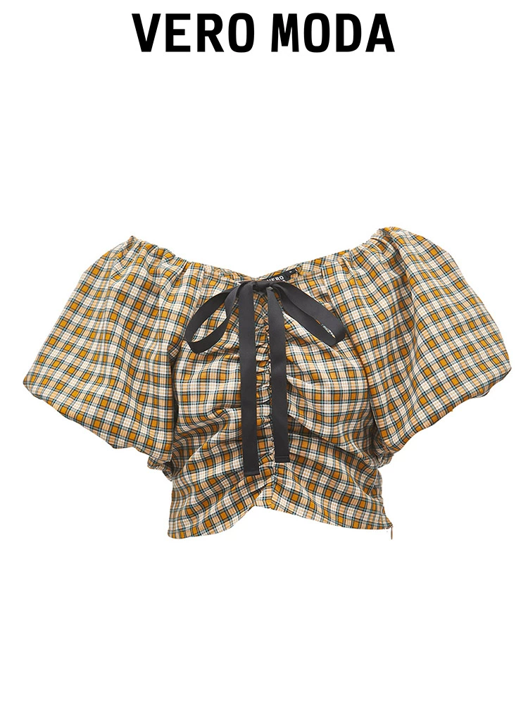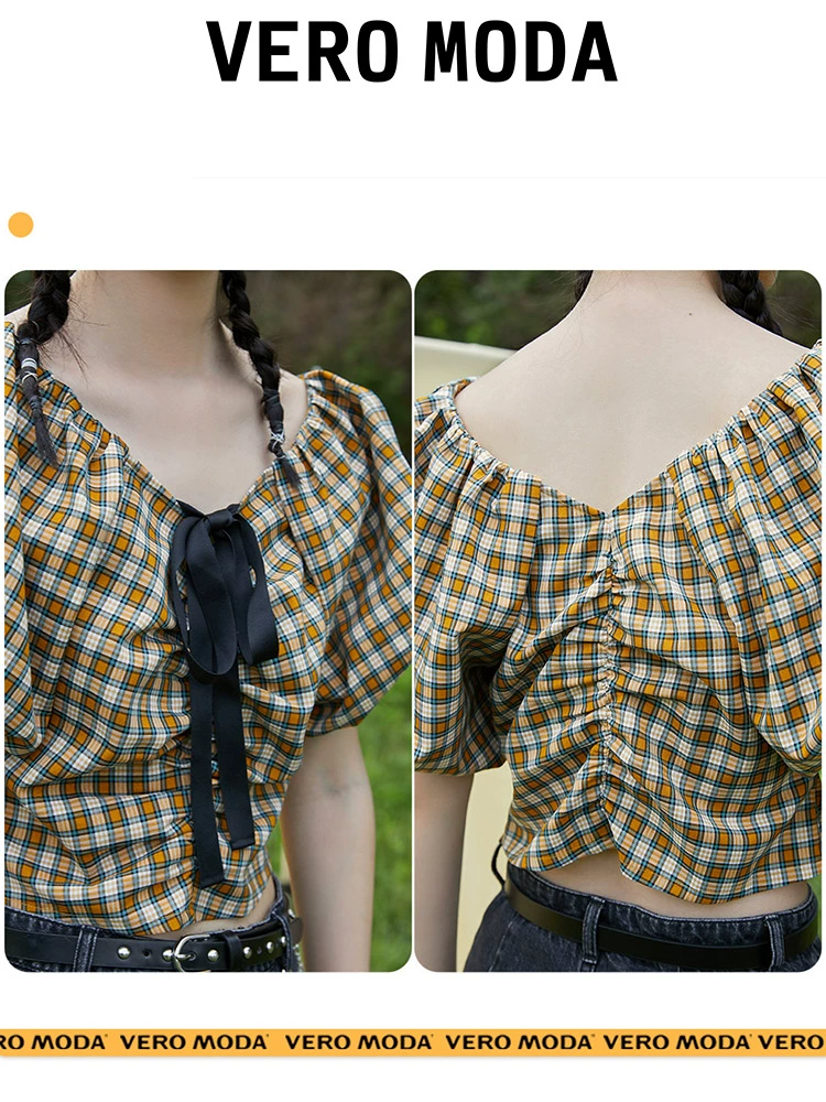 nameOriginal | Vero Moda Outlet Summer Clearance Retro Plaid Puff Sleeve V-neck Short Fashionable and Chic Short Sleeve Top for Women |