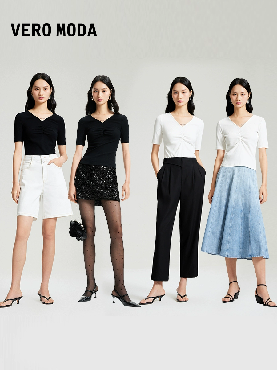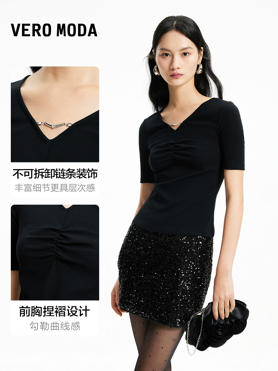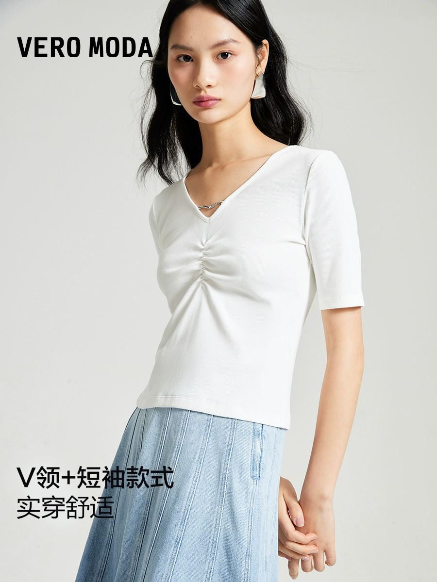 Vero Moda Outlet T-shirt Women's 2024 Summer New V-neck Slim Chain Pleated Elegant Top