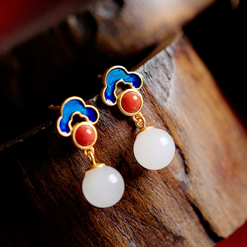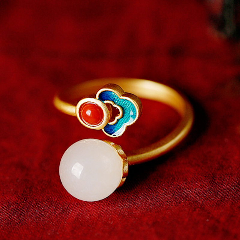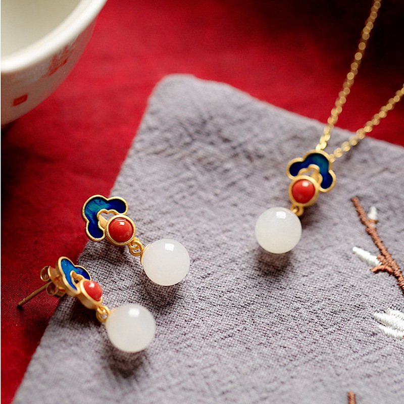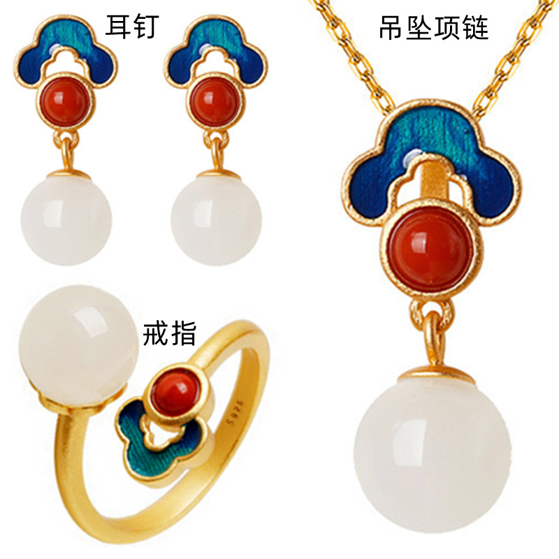 Vietnam Sand Gold Chinese Style Good Things Lian Ruyi Xiangyun White Jade Ring Pendant Necklace Earrings Jewelry Set