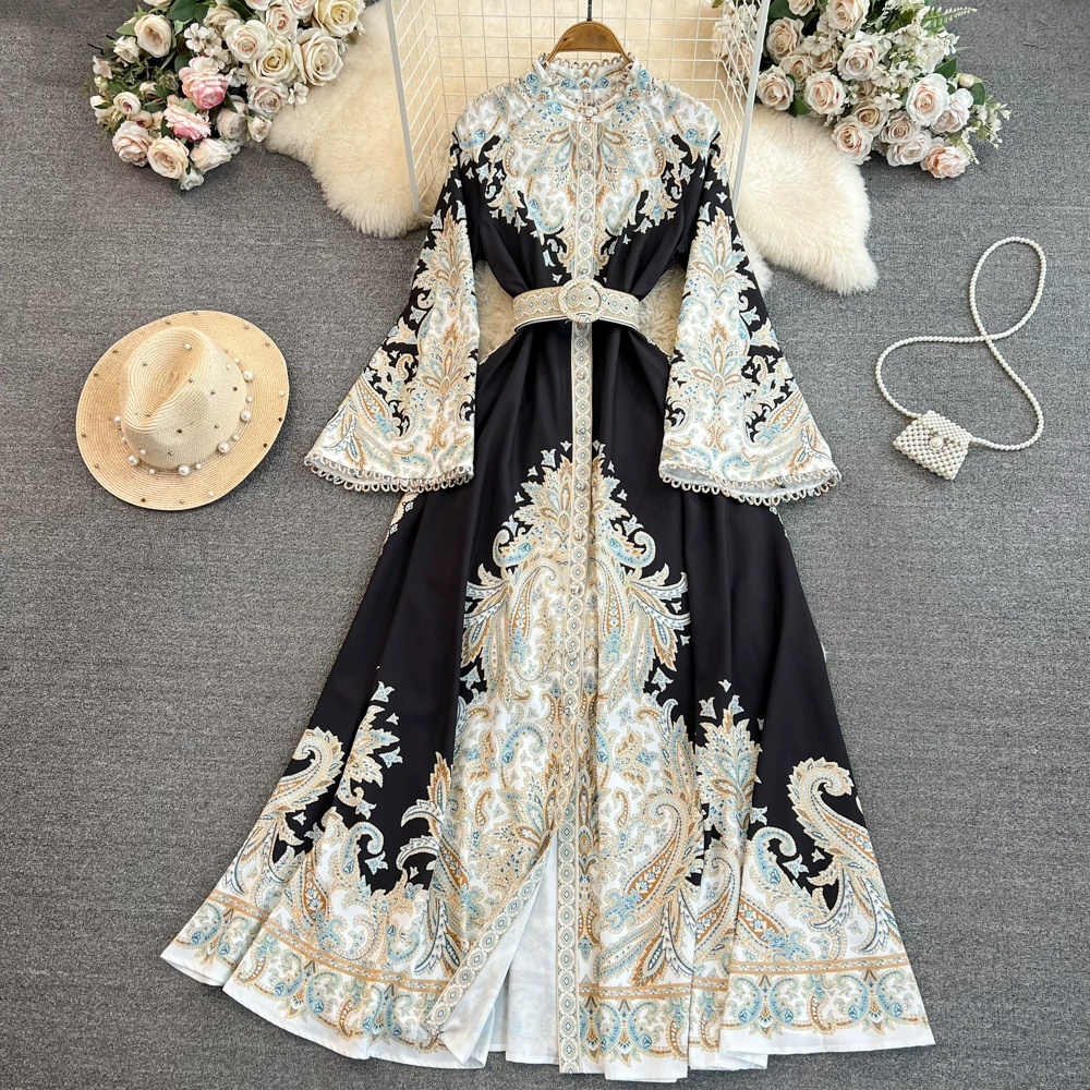 Vintage bell sleeve single breasted elegant printed dress