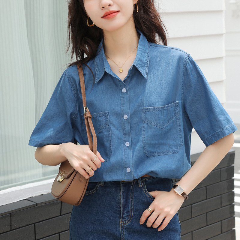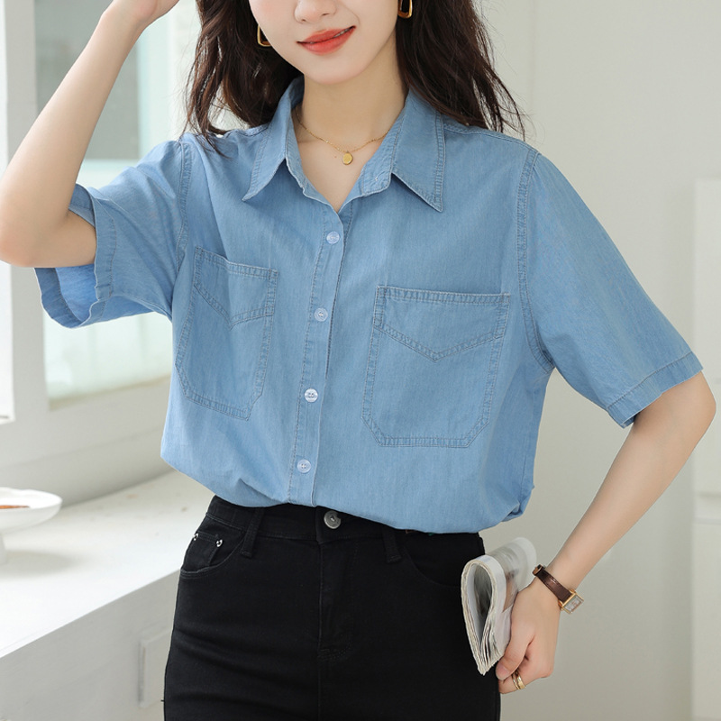Vintage Blue Short-sleeved Thin Denim Shirt Women’s 2024 Summer New Casual Loose Hong Kong-style Small Top