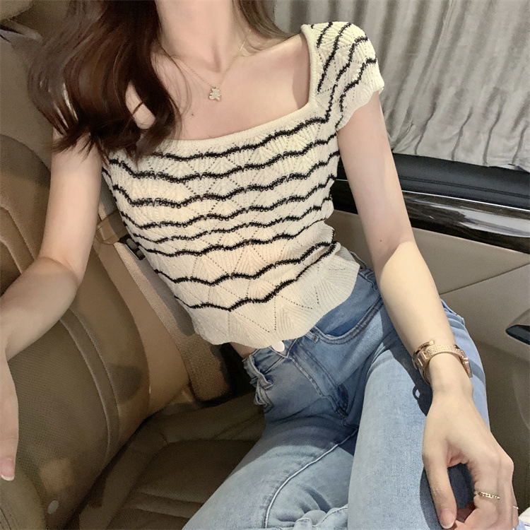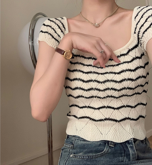 | nameOriginal | Vintage Commuter Striped Thin Square Collar Top Design Sense Niche Slim-fit Clavicle Ice-curled Knit Shirt Short-sleeved Women |