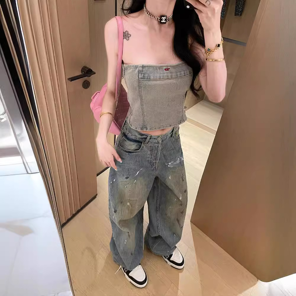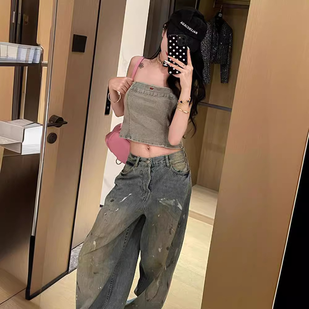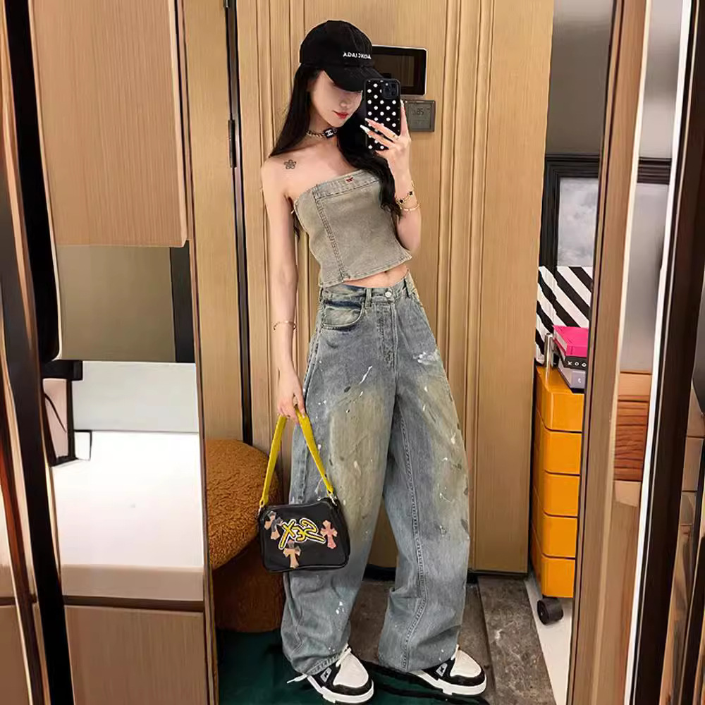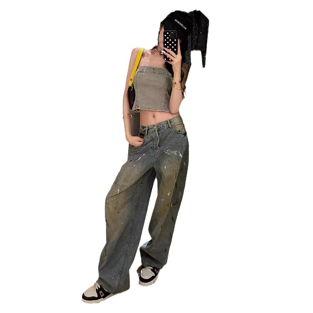 | nameOriginal | Vintage distressed graffiti splash ink jeans women's summer new all-match high waist straight tube loose wide leg long pants fashion |
