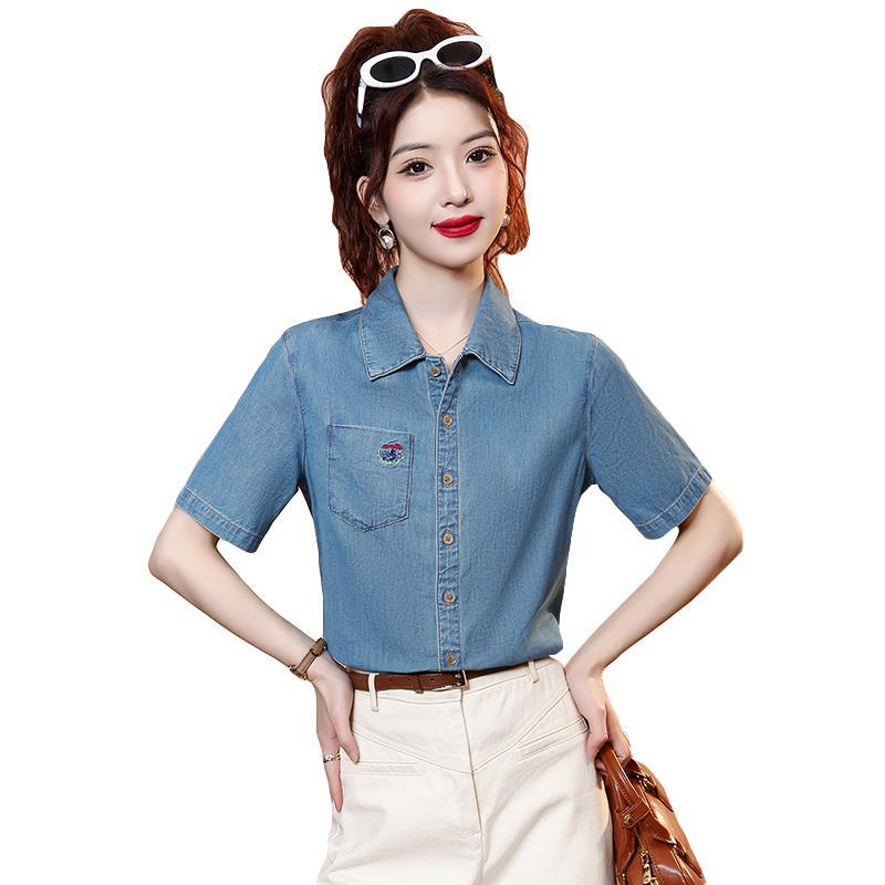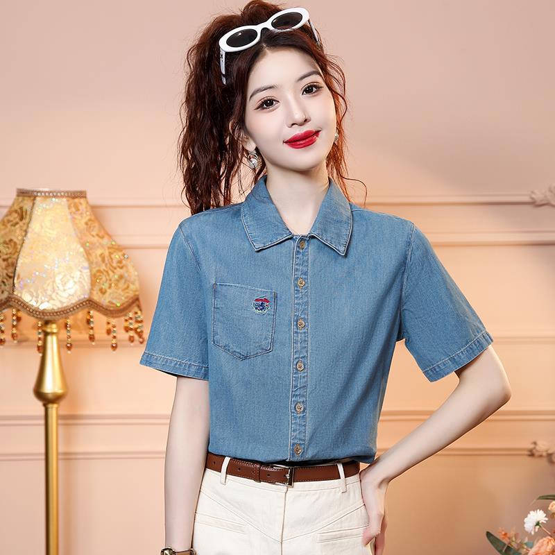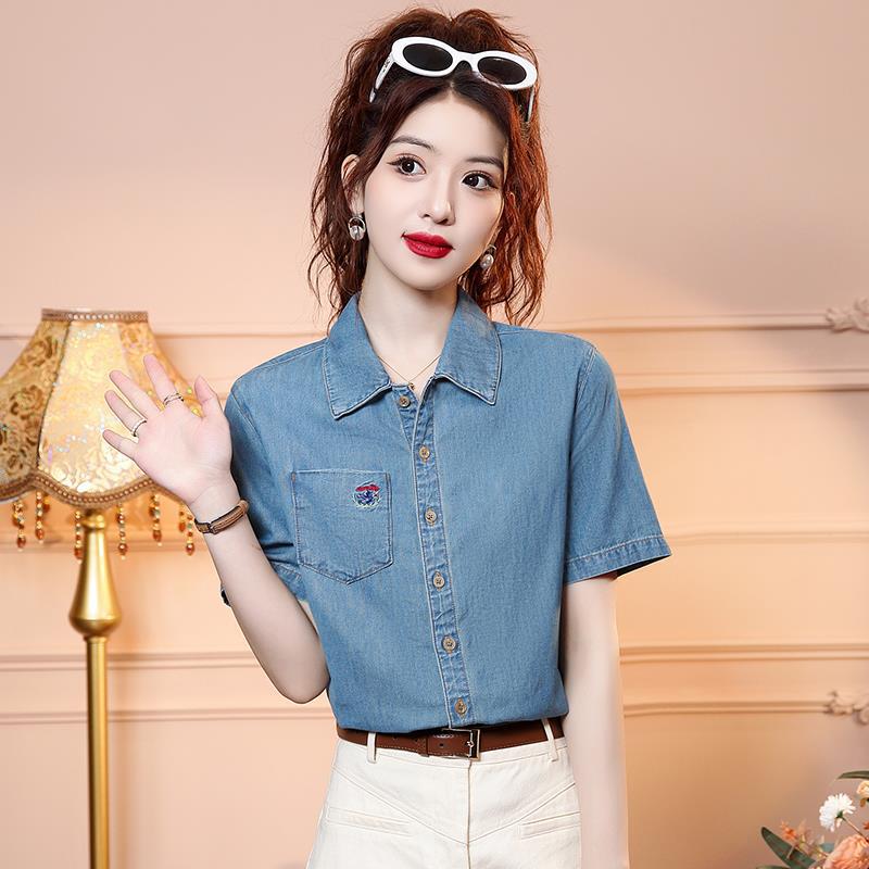 | nameOriginal | Vintage Embroidered Denim Shirt Women's Summer New 2024 Polo Collar Short Sleeve Loose Single-Breasted Small Shirt Top |