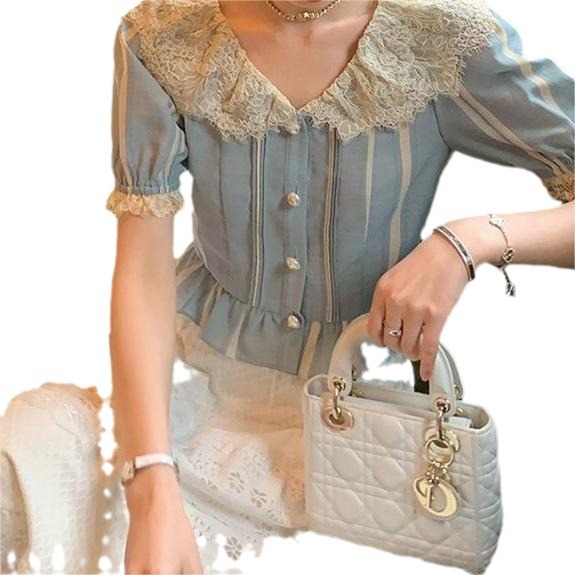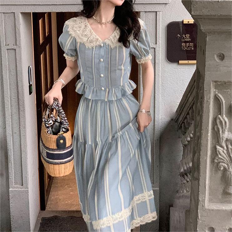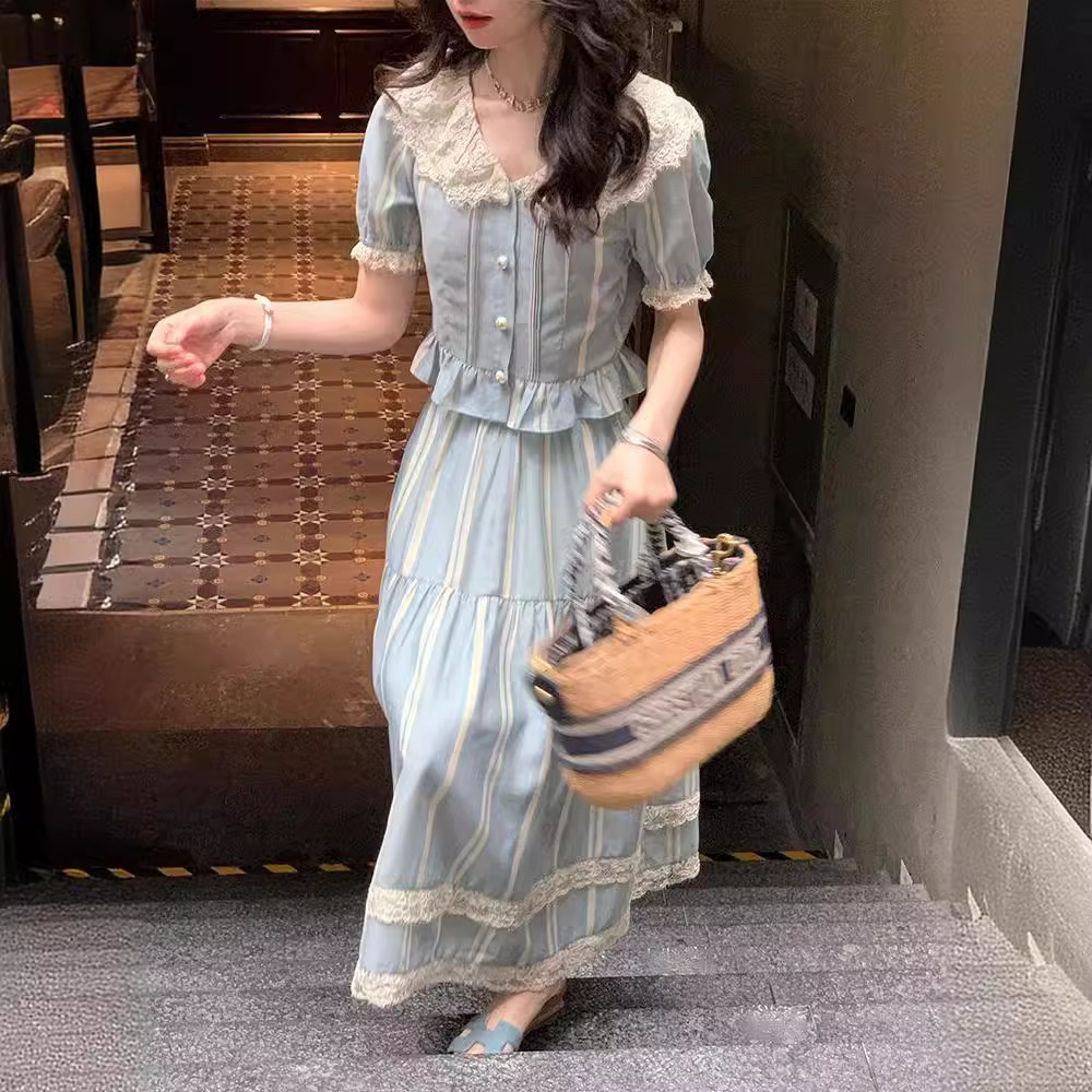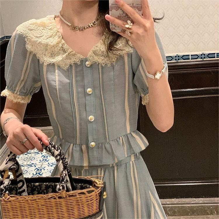 Vintage Fashion Stylish suit Women’s Summer New Arrival French Striped Shirt Lace Skirt Two-Piece Set