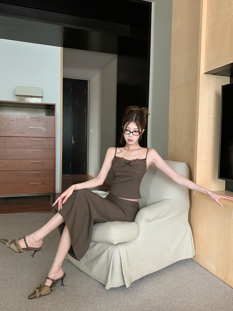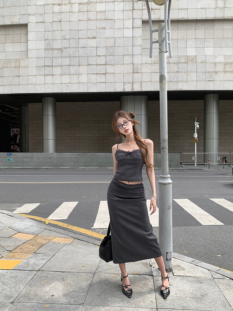 | nameOriginal | Vintage Grey Set Lace Stitching Camisole Top Women's Summer High Waist Half-length Dress Spice Girl Two-piece Set |