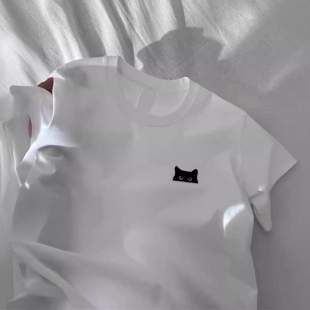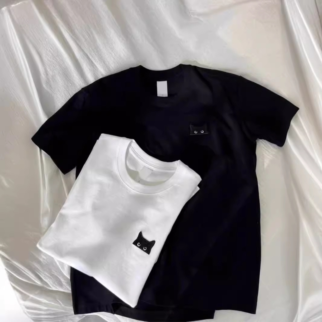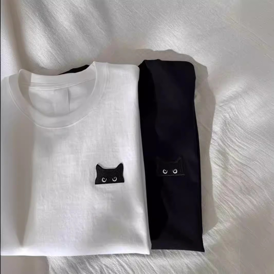 | nameOriginal | Vintage Hong Kong Style Cat Embroidered Cotton Short-sleeved T-shirt Women's Summer 2024 Early Spring Loose Student Half-sleeved Couple's Top |