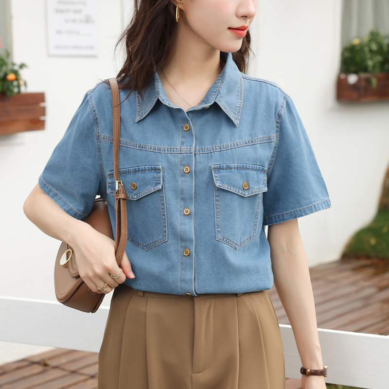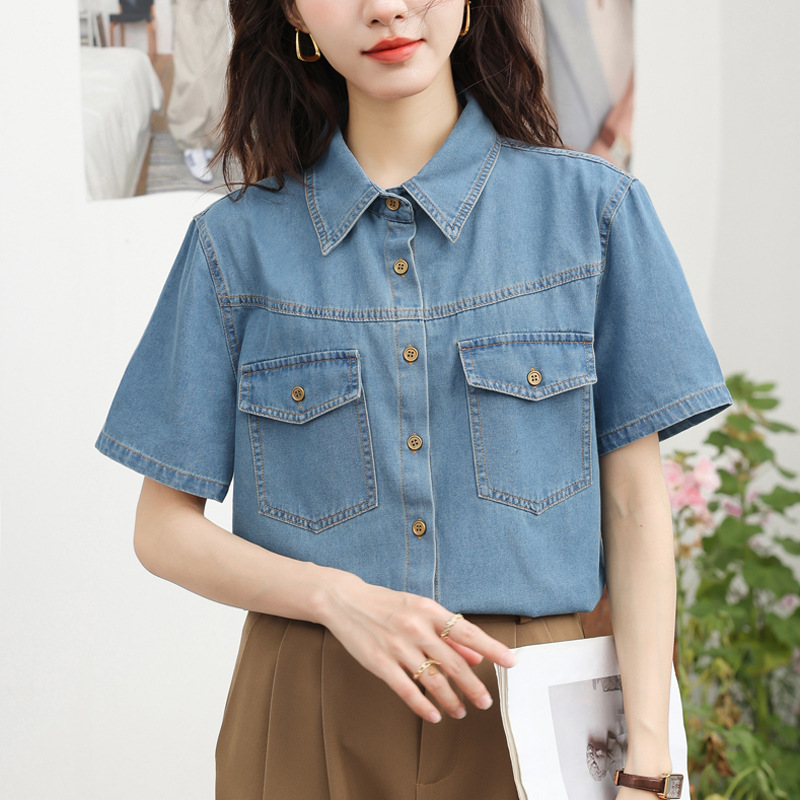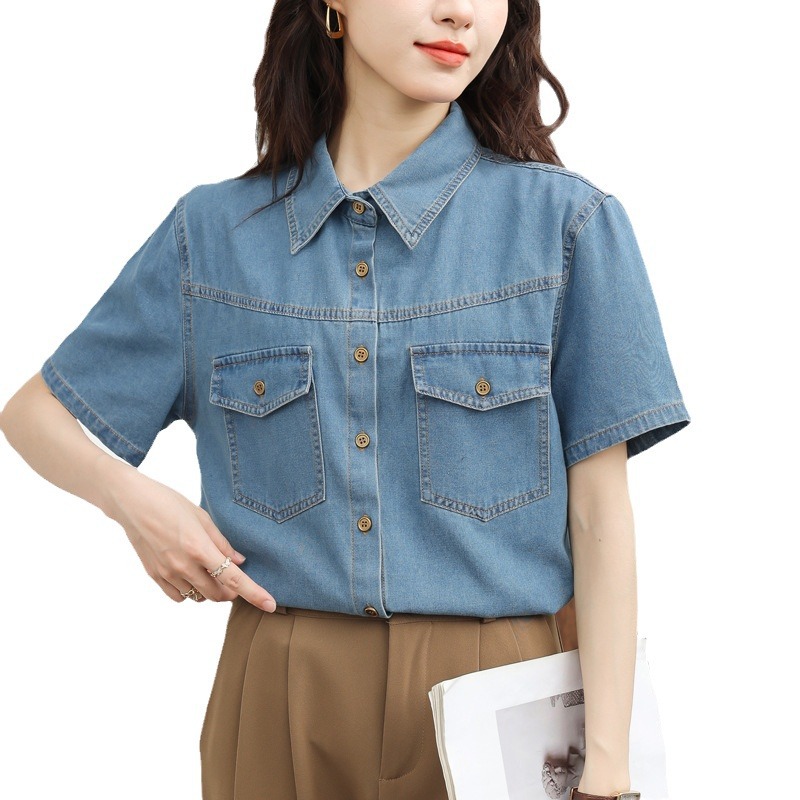 | nameOriginal | Vintage Hong Kong-style Denim Short-sleeved Shirt Women's 2024 Spring/Summer Design Sense Loose Shirt Shoulder Top |