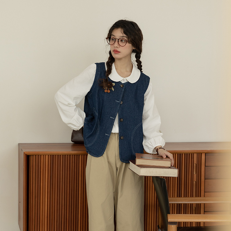 | nameOriginal | Vintage Hong Kong Style Denim Vest Jacket Women's 2024 Spring New Japanese Round Neck Loose Casual All-match Short Top |
