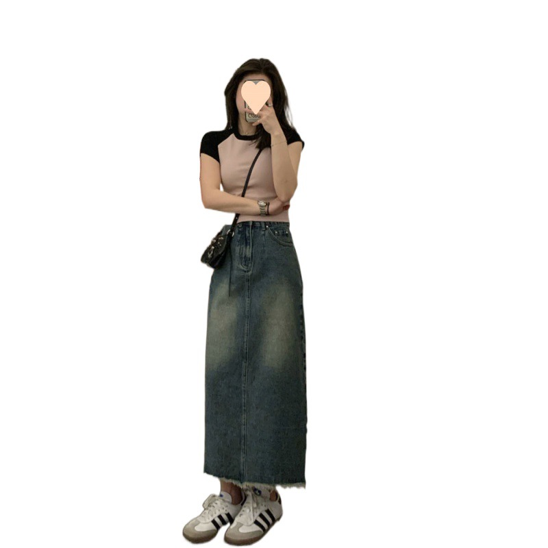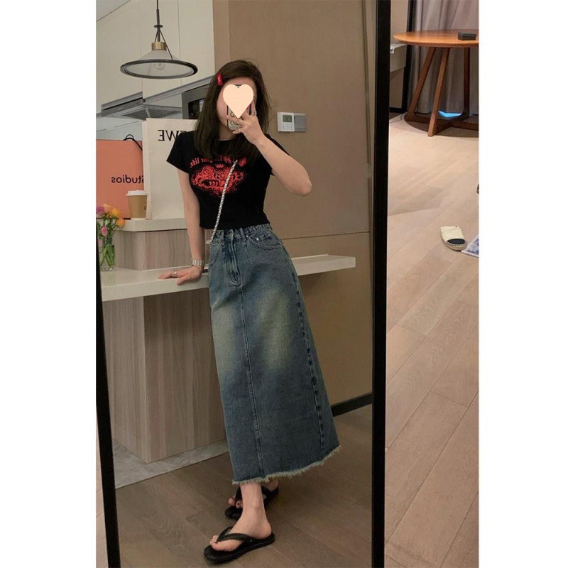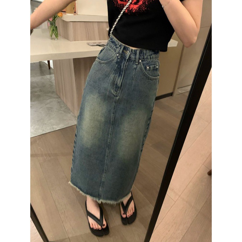 | nameOriginal | Vintage Hong Kong Style Split Rouge Denim Skirt Summer New High Waist Slimming Small Character Midi Skirt |