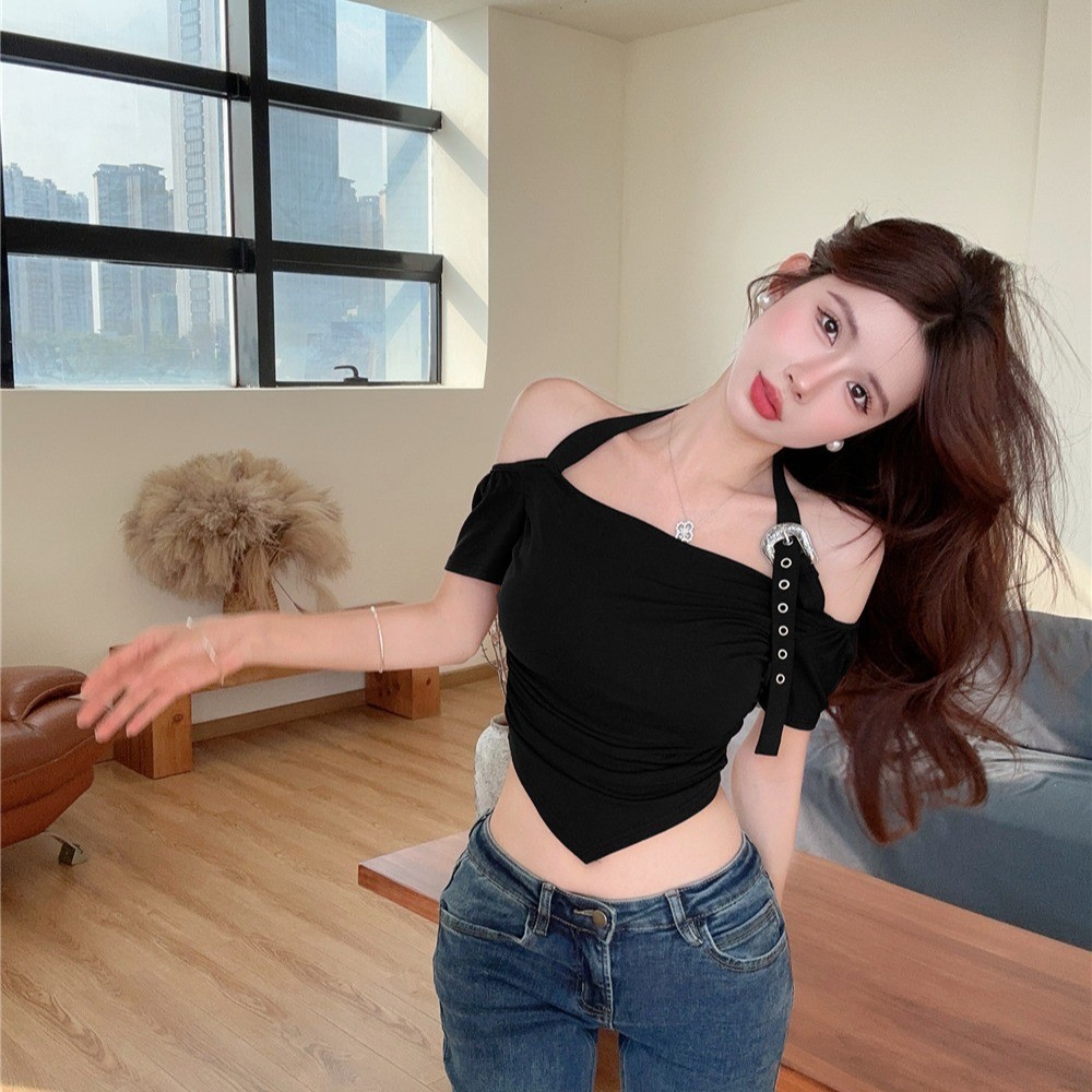 | nameOriginal | Vintage Metal Buckle Lace-up Neck Short-sleeved T-shirt Women's Design Irregular Short Top Sexy Base Shirt for Summer |