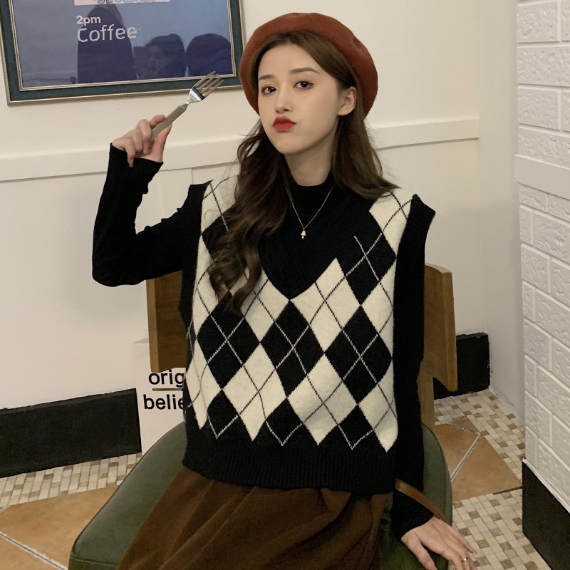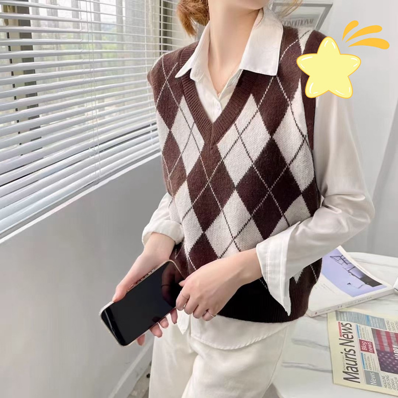 | nameOriginal | Vintage Rhombic Knitted Vest Women's Outer Waiver New 2023 Korean Sweater Vest Jacket Loose Top All-match |