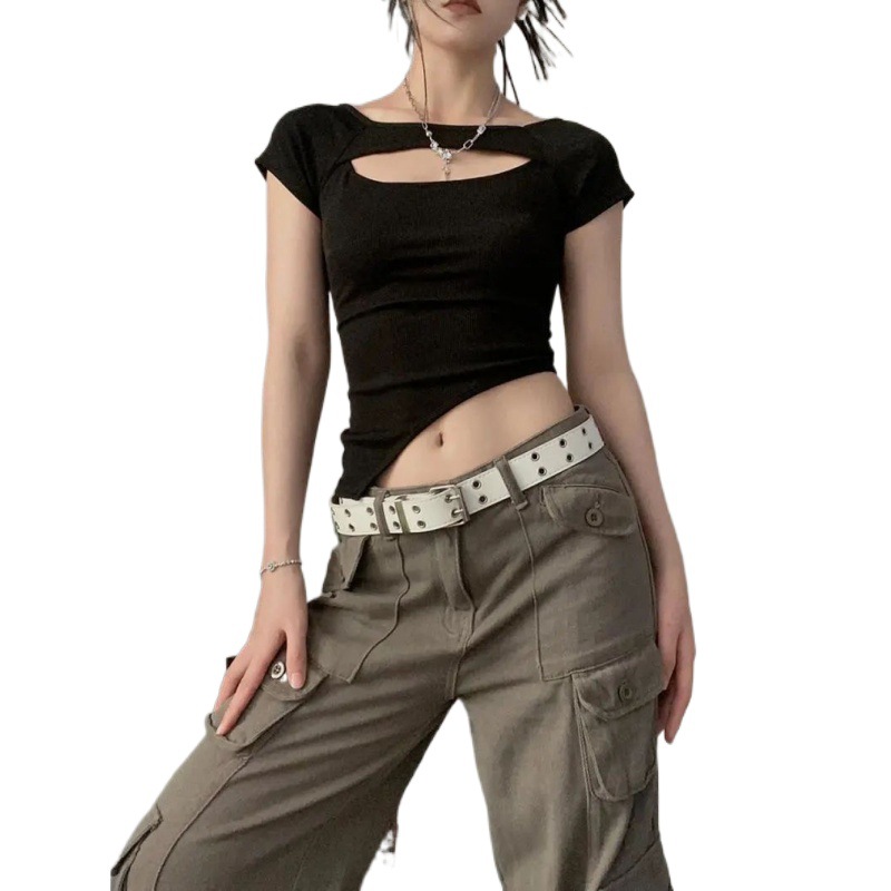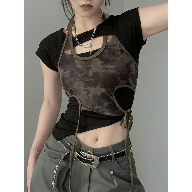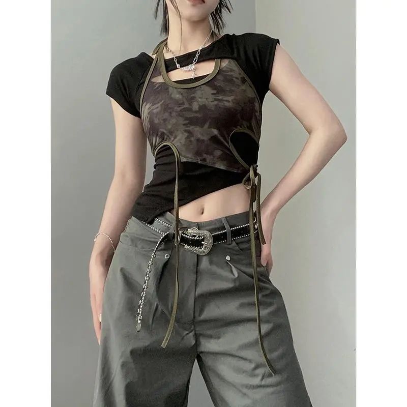 | nameOriginal | Vintage Spice Girl Camouflage Printed Mesh Neck Strap Summer Slim-fit Slimming Irregular Short Top Two-piece Set |