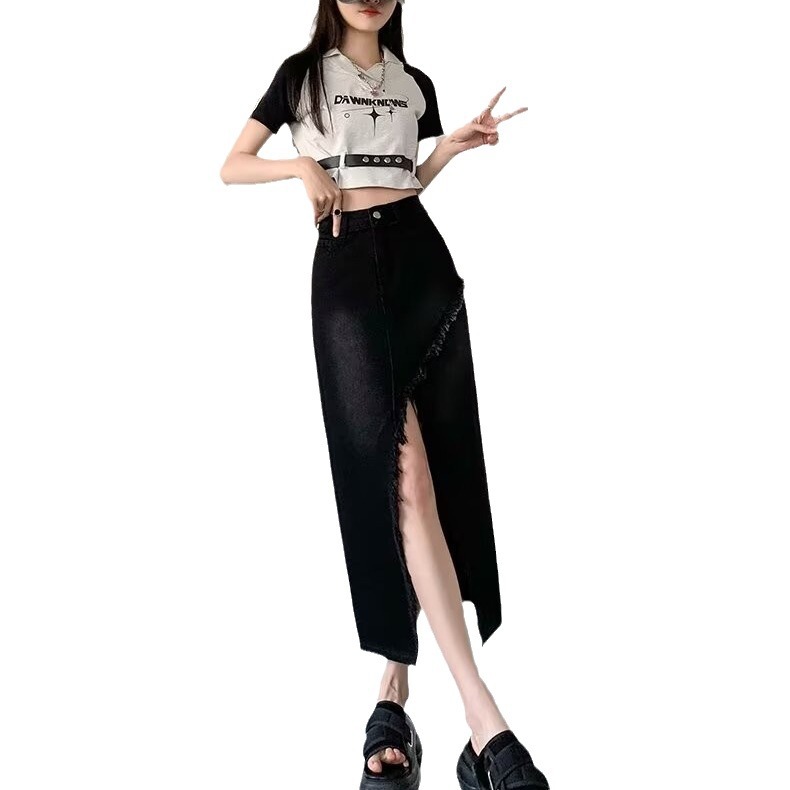 Vintage Split Denim Skirt Women's 2024 New Summer High Waist A- Line Skirt Loose Mid-Length Skirt