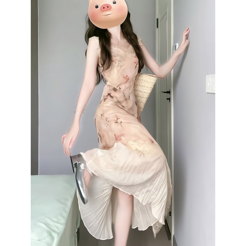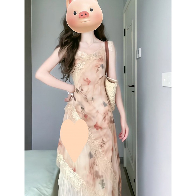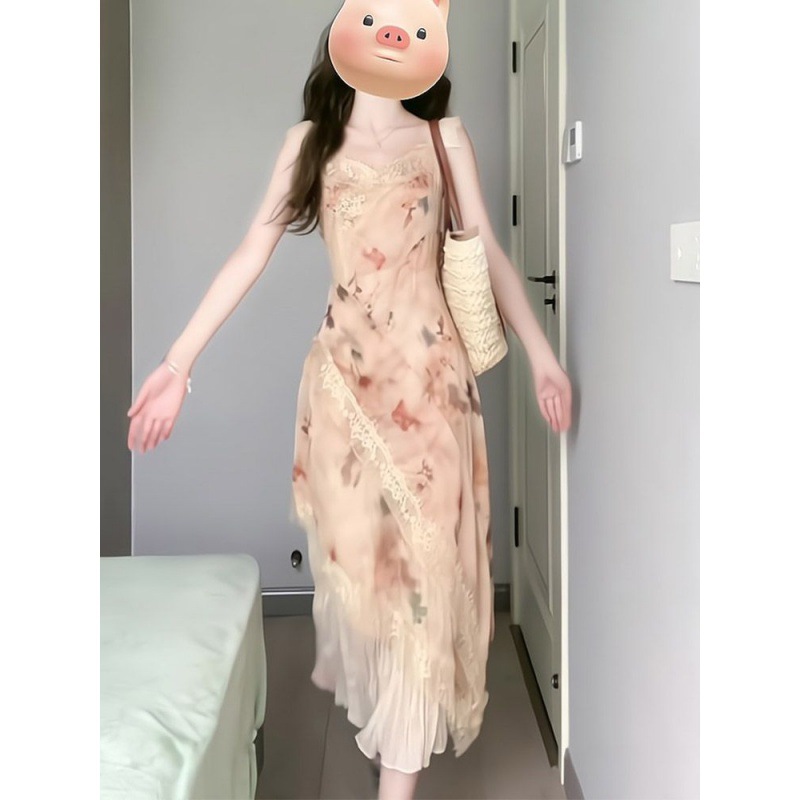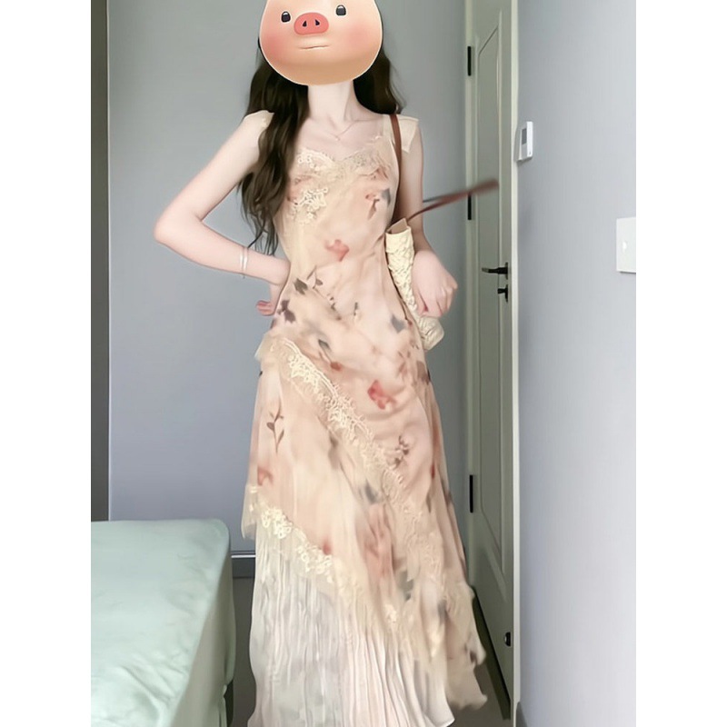 | nameOriginal | Vintage Stitching Floral Sling dress Women's 2024 Summer New French Waist Ruffled Mid-length Skirt |